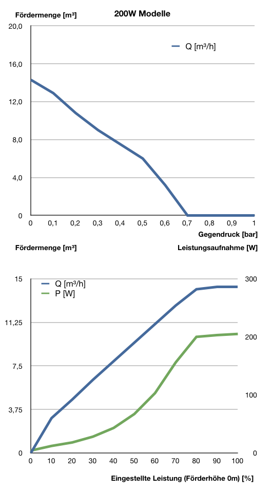 Wenn Sie bei den Diagrammen unterschiedliche Höchstwerte zu denen in unserem Katalog sehen, so ist dies gewollt. Der Hersteller testet die Pumpen an einem "extremen" Prüfstand mit den schlecht möglichsten Parametern. Wenn Sie die Pumpen zu Hause installieren, werden Sie immer bessere Werte erhalten als angegeben.