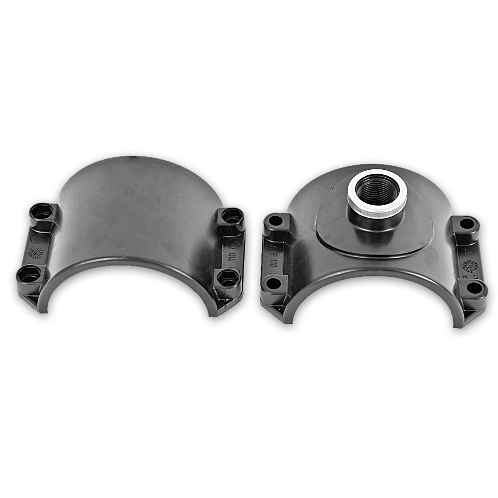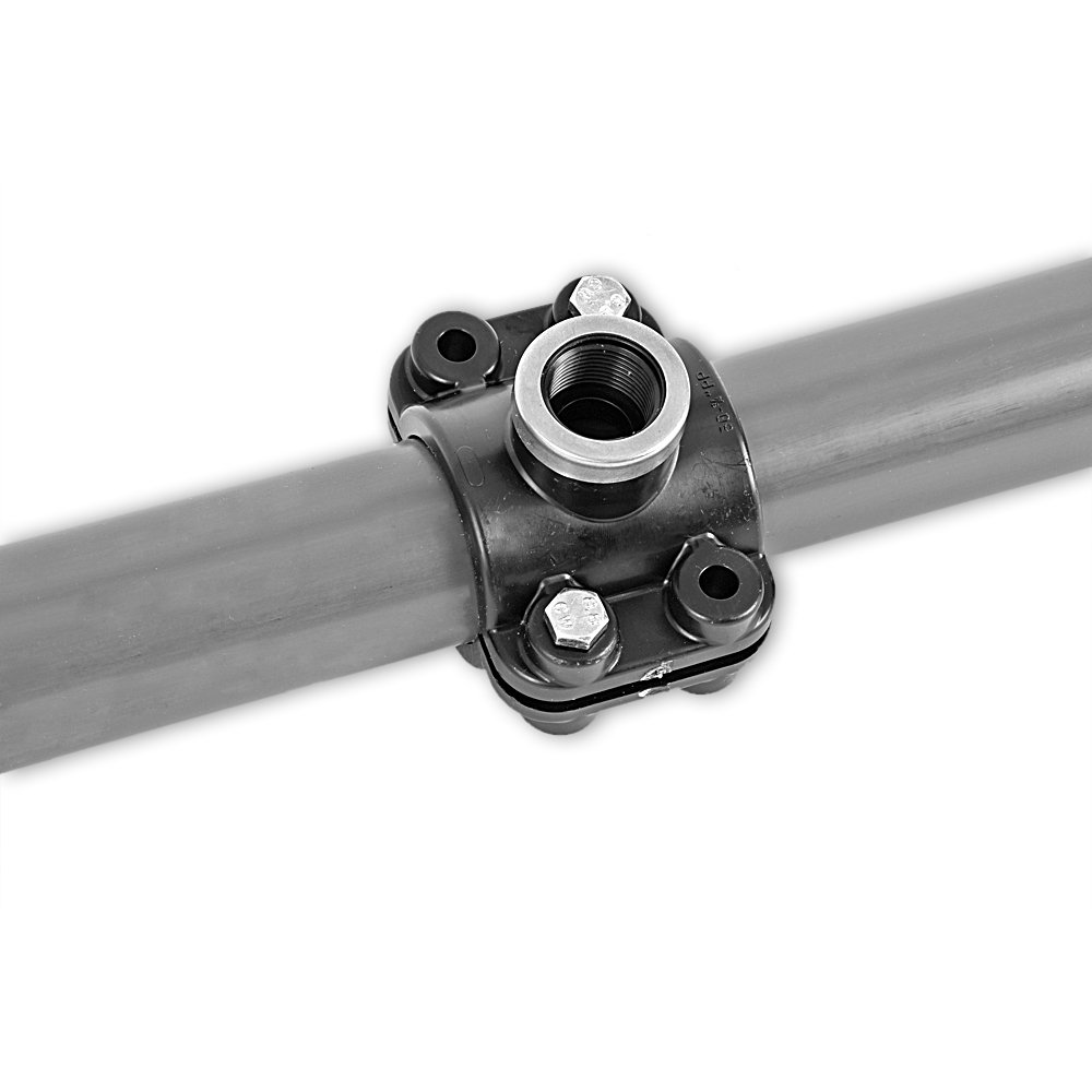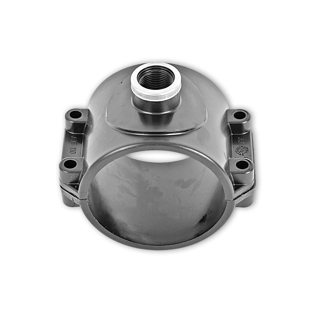 Anbohrschelle PP mit seitlichem 3/4 Zoll Innengewinde inklusive innenliegendem Dichtring und 4 Schrauben mit passenden Muttern.
