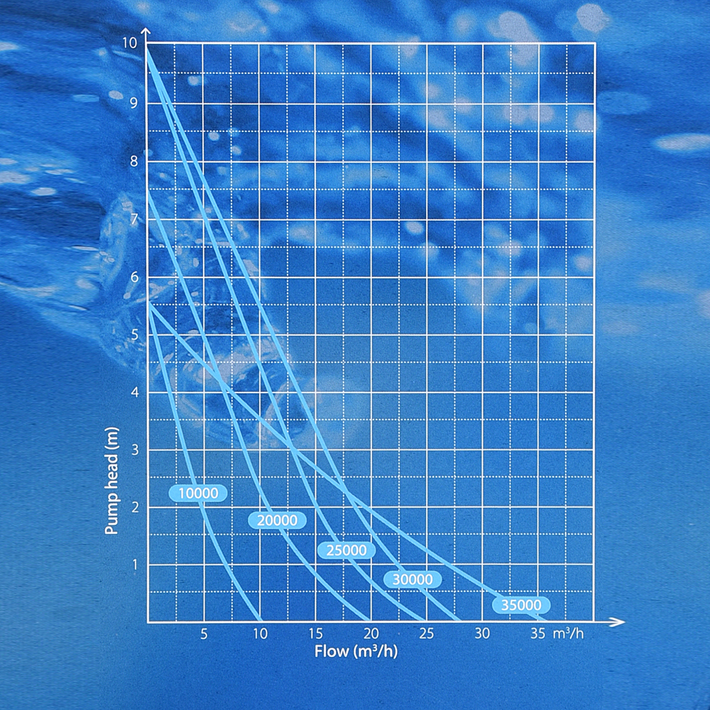 Das Modell 35 000 Wifi ist aufgrund seiner Ein- und Ausgäng und der Förderhöhe speziell bei Schwerkraftanlagen zu verwenden, also nach dem Filter. Sie kann viel Wasser mit "wenig" Energie zum Teich pumpen. Wir empfehlen  90er oder 110er Rohr.