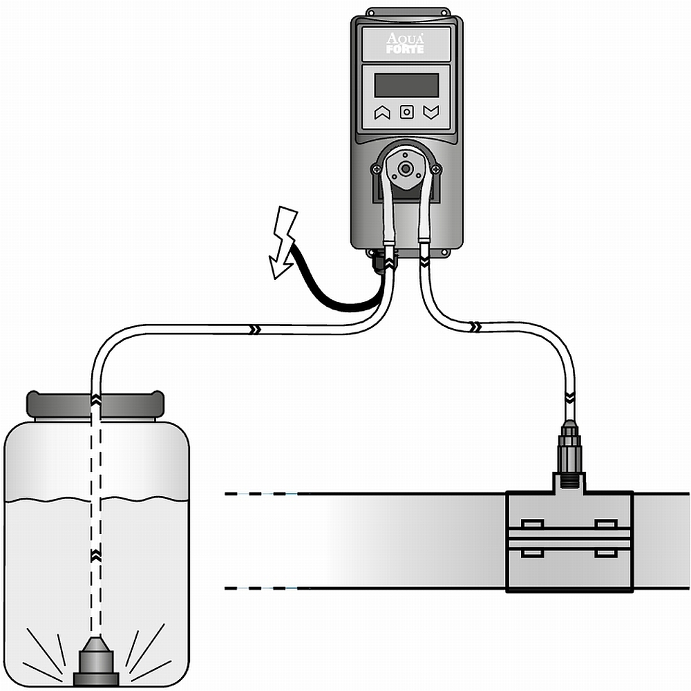 Es bietet sich an die Dosierpumpe mit unserer Anbohrschelle und dem dazu passenden Reduziernippel 3/4“ x 3/8“ (Art. Nr. 82497 für Anbohrschelle) zu verwenden. So kann die zu Dosierende Flüssigkeit direkt in die Rohrleitung des Teiches eingebracht werden.