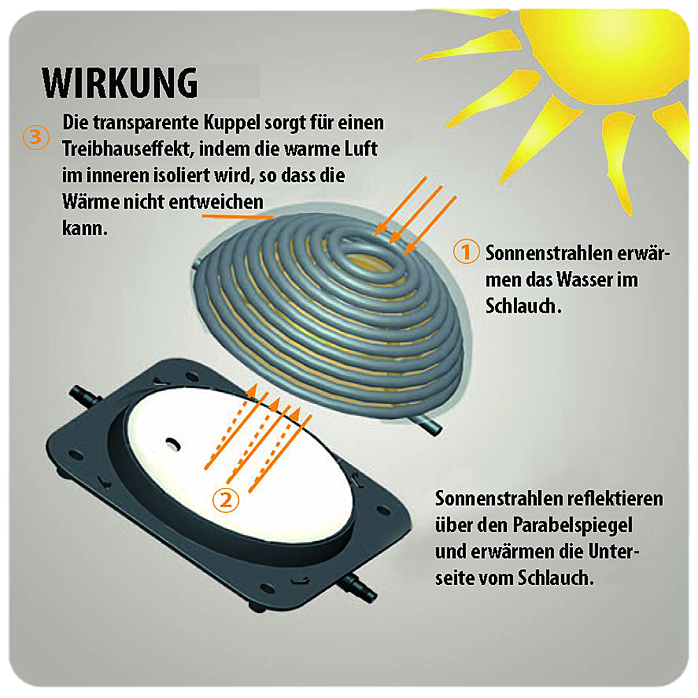 Der Solar Heizer Premium hat einen zusätzlichen refklektierenden Parabelspiegel für eine noch stärkere Heizleistung.