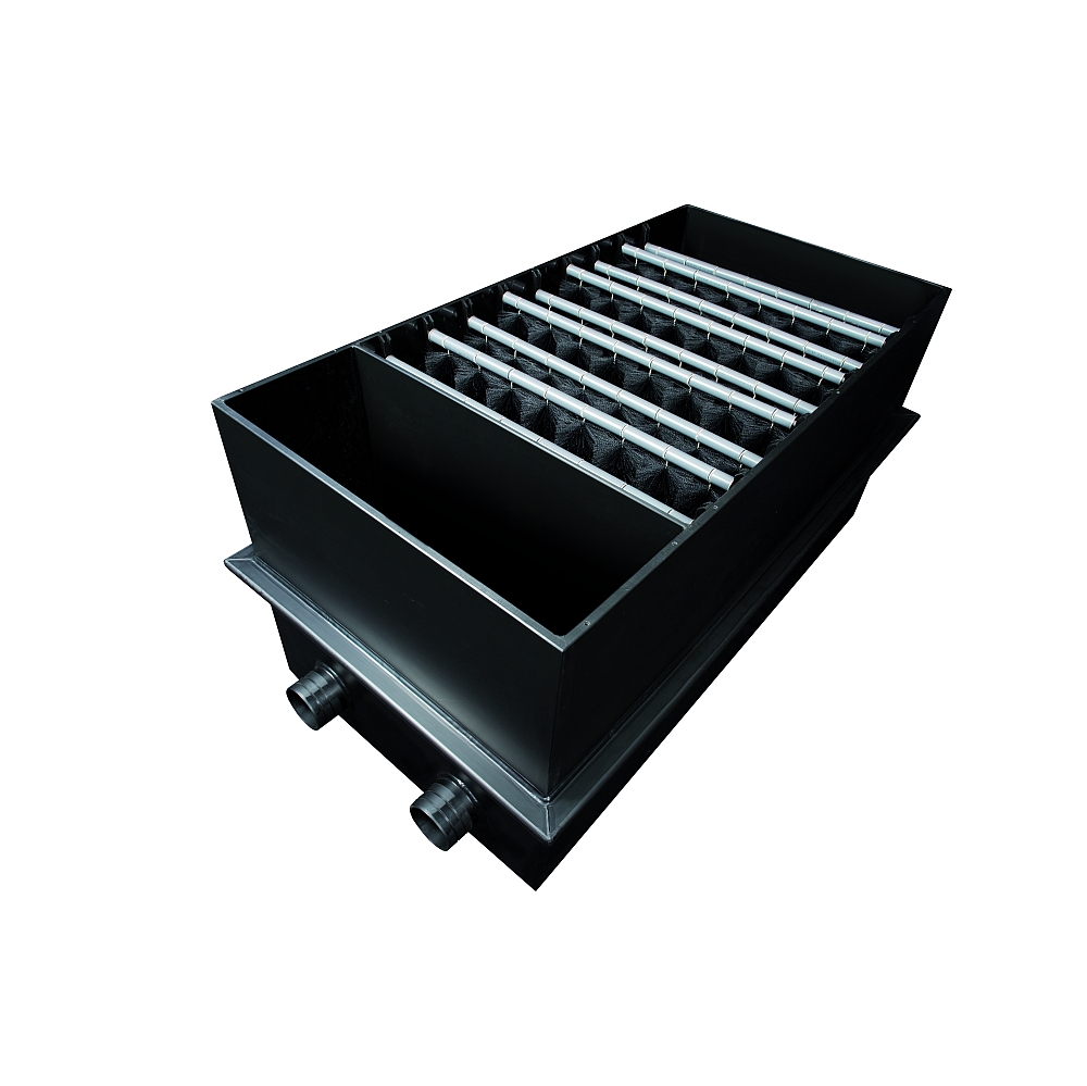 Mit dem EVO Brush, der Neukonzeption des althergebrachten Bürstenfilters. Dabei wird das in den FIlter einströmende Wasser im Mehrkammerprinzip abwechselnd von oben nach unten durch den Filter geleitet oder kann (zumindest solange die Bürsten noch sauber sind) den kürzesten Weg durch die Bürste wählen. Bis es schließlich nach etwa zwei Meter Filterlänge und einem zurückgelegten Filterweg von 8 Meter bei den im Filter integrierten Pumpen und UVC-Lampen (nicht im Auslieferungszustand enthalten) angekommen ist, wurde es vollständig von sämtlich sichtbaren Verunreinigungen befreit und biologisch aufbereitet.