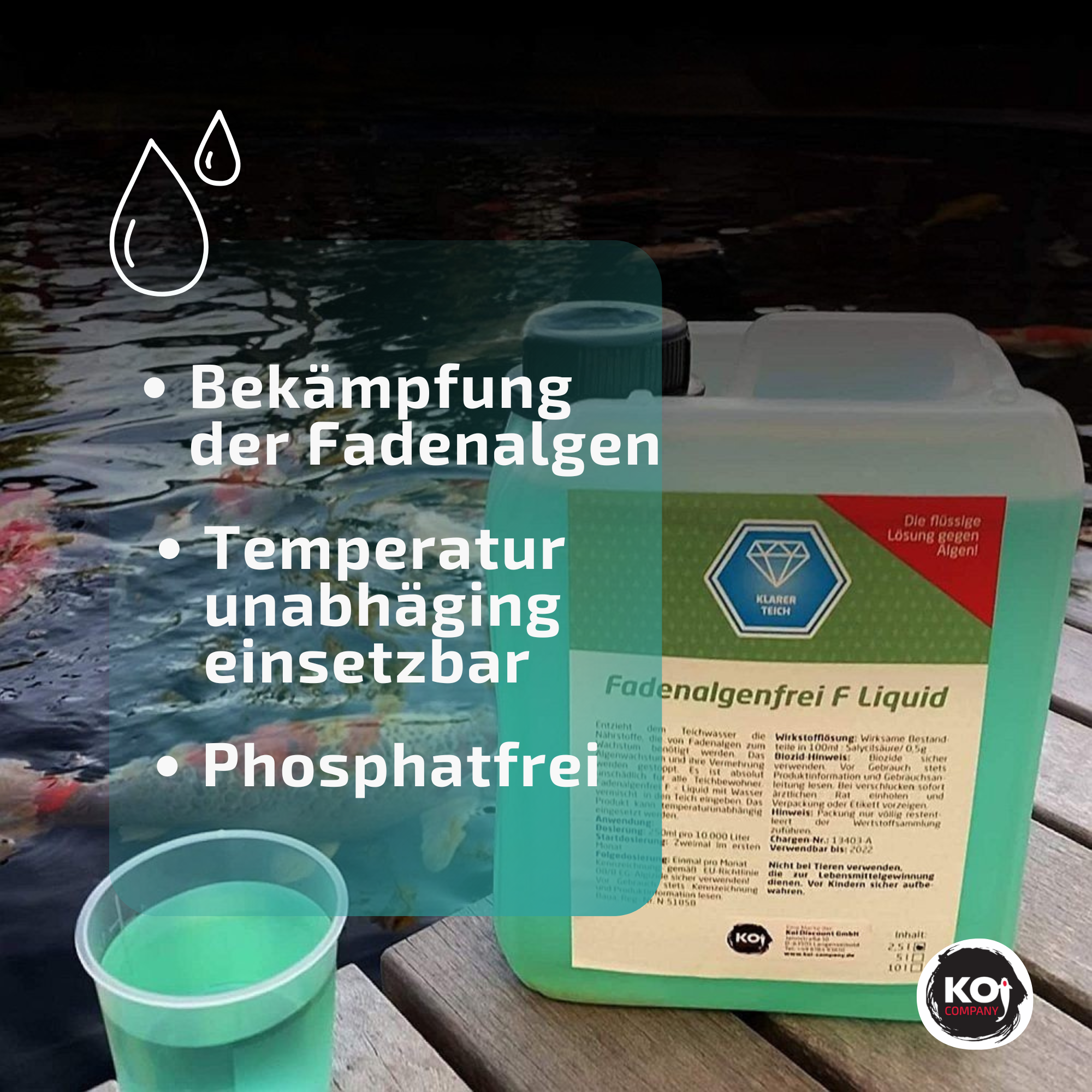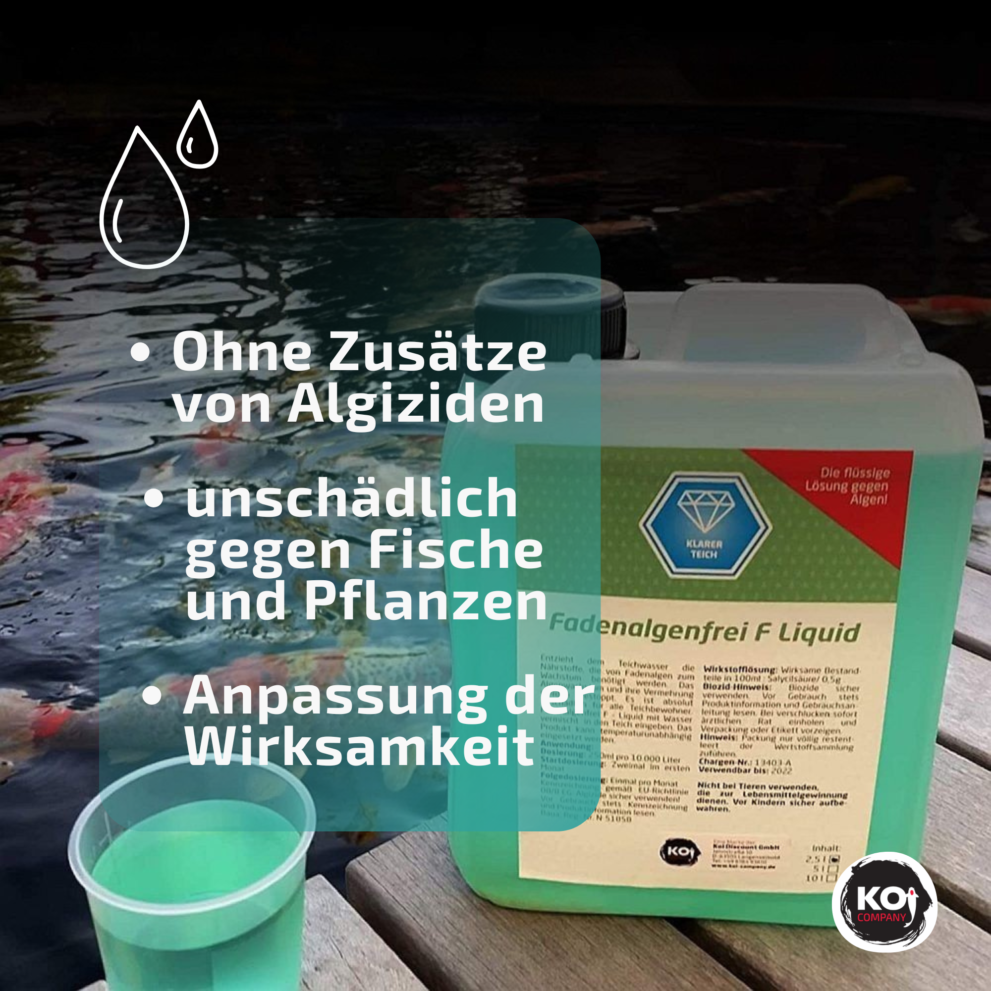 Fadenalgenfrei F von Koi Company besteht aus Lebensmittelzusatzstoffen und ist auch bei einer Überdosierung (bis zur dreifachen Menge) unschädlich gegen Fische und Pflanzen. Dieses Mittel wäre selbst für den menschlichen Verzehr geeignet, es enthält keinerlei Algizide oder Biozide. Sie erwerben ein Mittel, welches die Ursache (Algen) bekämpft und dank seiner Wirkstoffe Ihren Teich von lästigen abgestorbenen Algen freihält, weil sie nicht in dem Umfang von anderen Mittel nachwachsen. Damit auch bei Ihnen das Fadenalgenfrei F wirkt, bedenken Sie bitte folgendes: Die Dosierung muss dem tatsächlichen Wasservolumen entsprechen. Lieber etwas mehr dosieren, als zu wenig.