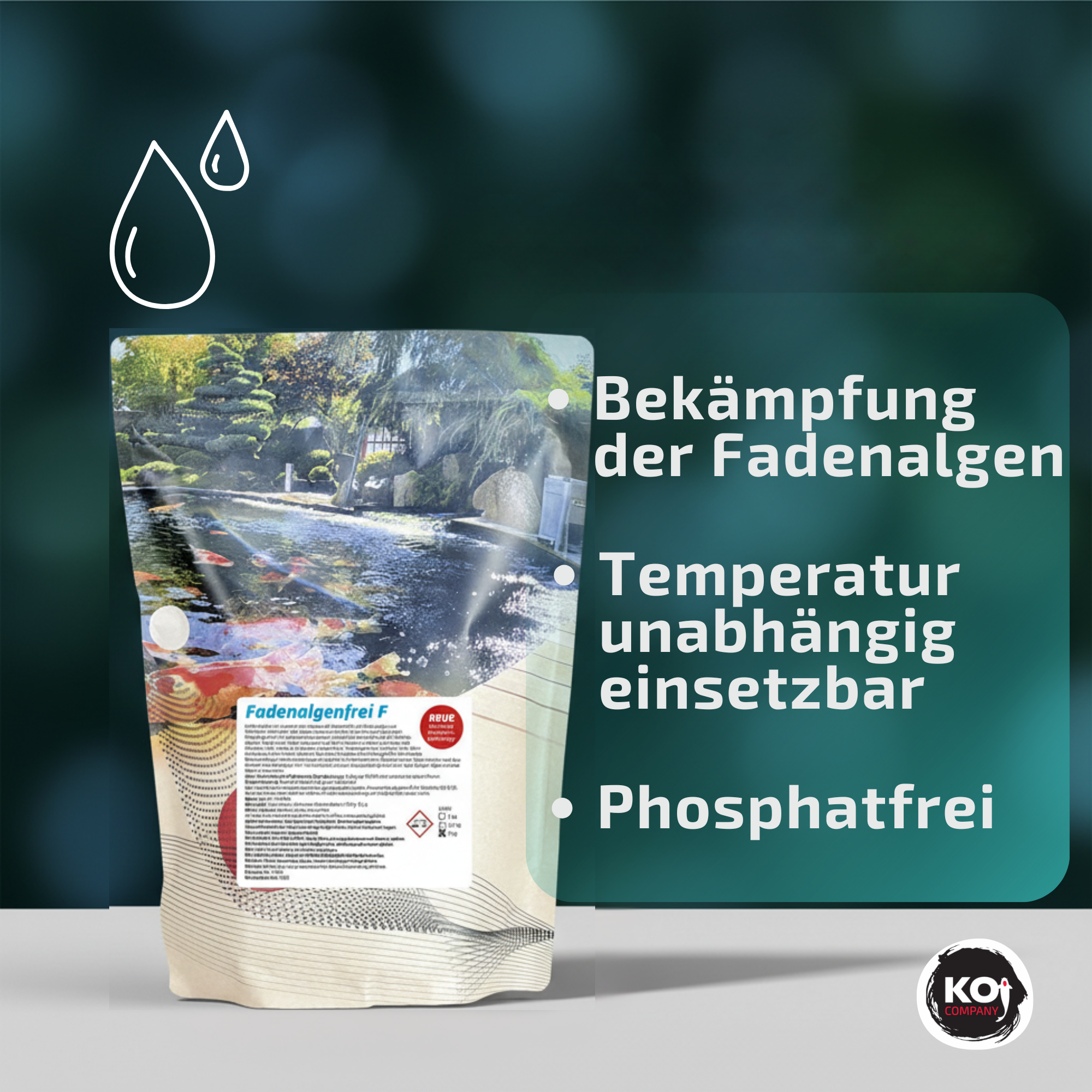 Bei diesem Produkt handelt es sich um einen Fadenalgenvernichter ohne jegliche Zusätze von Algiziden. Die Fadenalge löst sich auf, das Absterben der Algen beginnt und Ihr Teich ist wieder algenfrei. Fadenalgenfrei F ist außerdem absolut phosphat-frei!