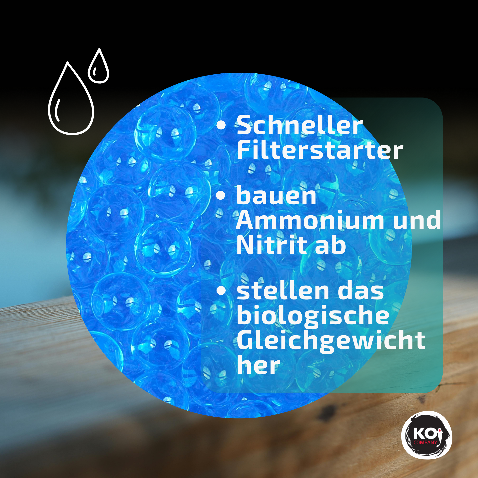 Diese Filterkugeln bestehen aus einem Agargranulat, gefüllt mit den Koi Company Filterbakterien. Alle Komponenten zusammen werden in einer sogenannten „Mikroorganismen Suppe“ getränkt, bis die Kugeln ihre volle Größe erreicht haben. Eine eingebrachte Sauerstoffversorgung hält die Mikroorganismen für eine lange Zeit am Leben.