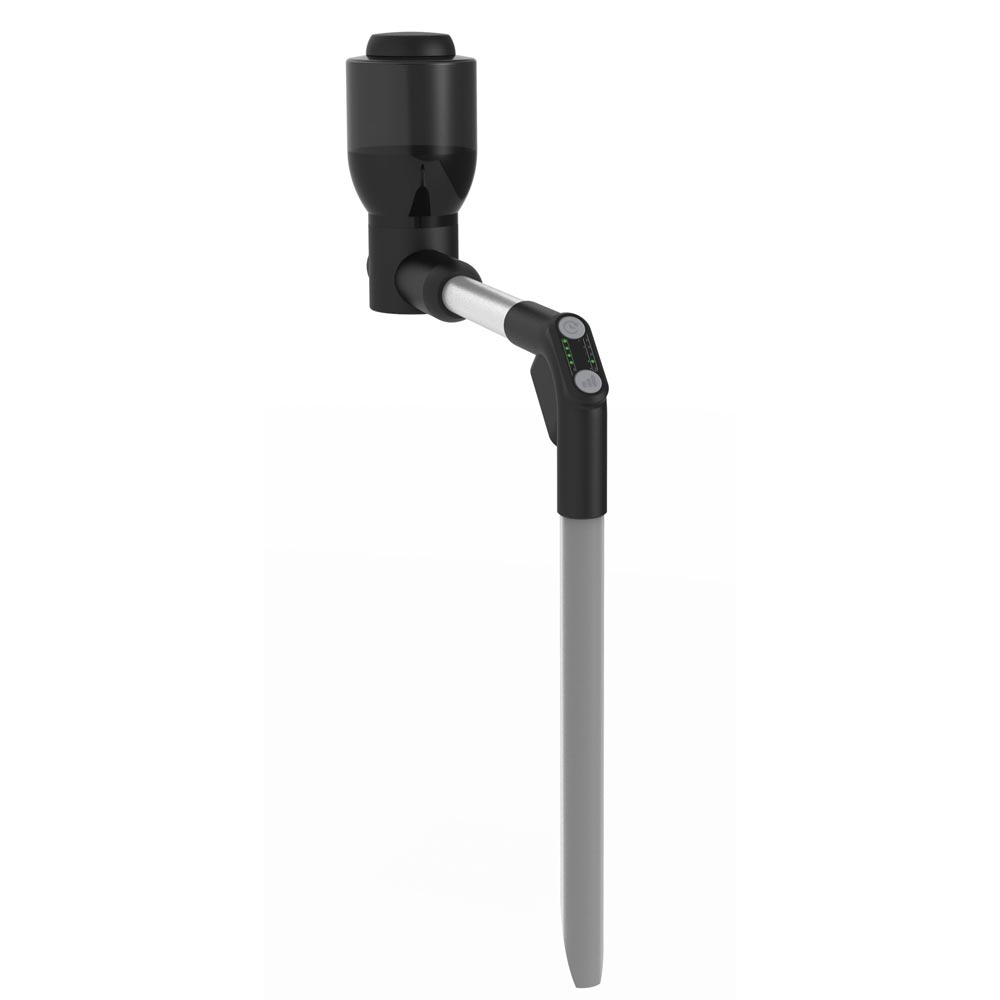 Der Automat wird mit einem stabilem Ständer mit Spitze in der Erde befestigt.