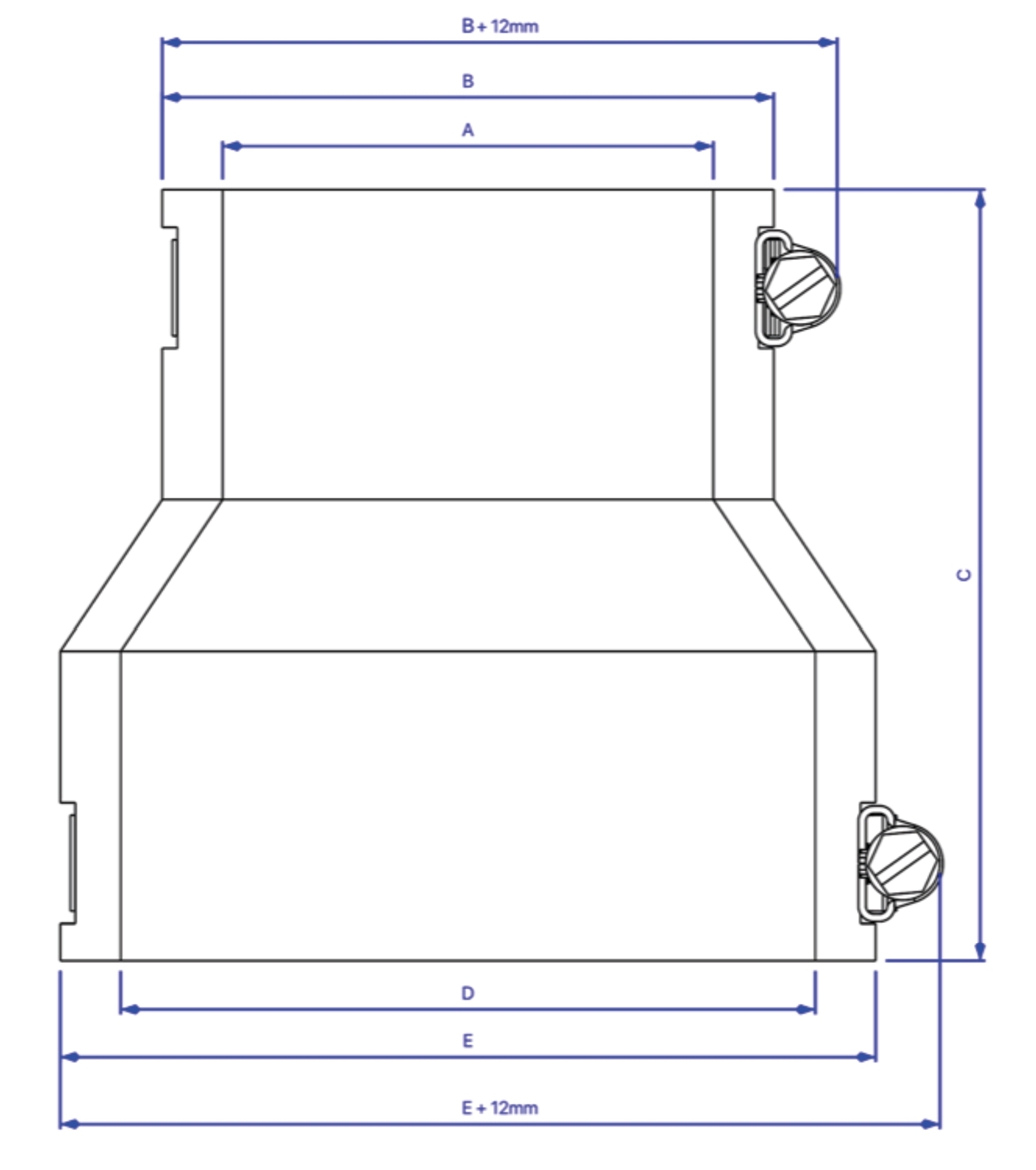 (A) Innendurchmesser oben (B) Außendurchmesser oben (C) Länge (D) Innendurchmesser unten (E) Außendurchmesser unten
