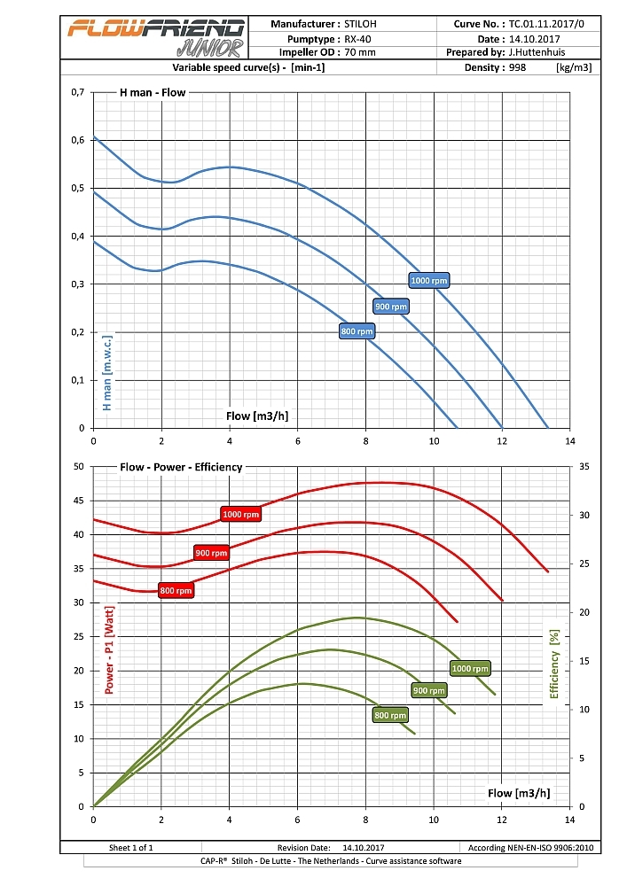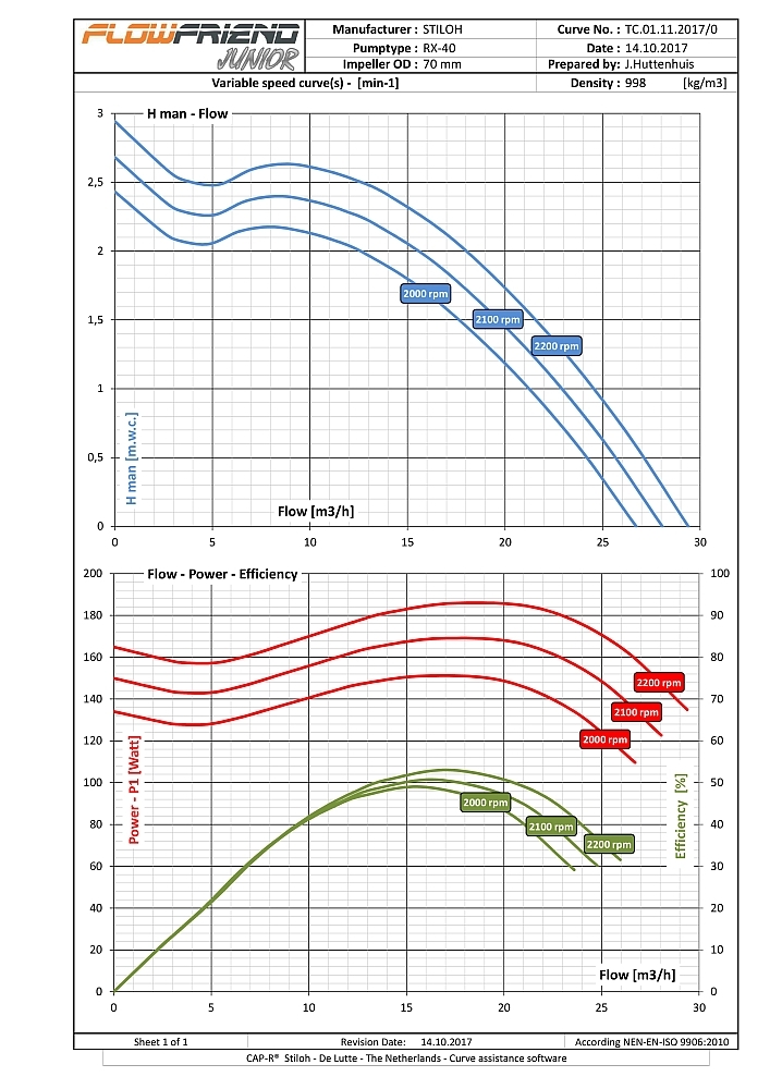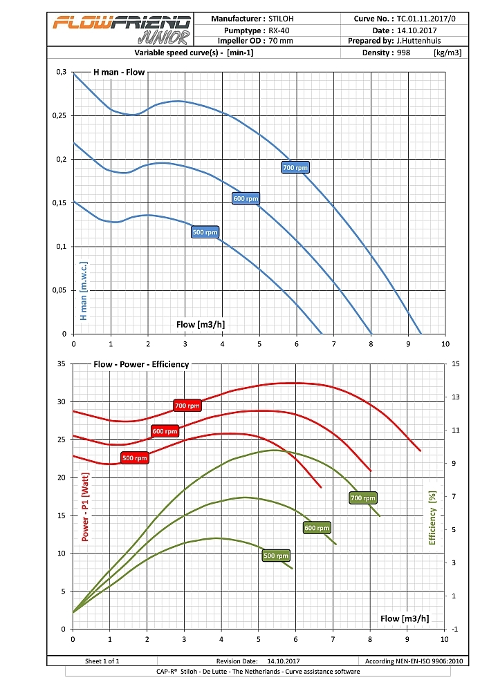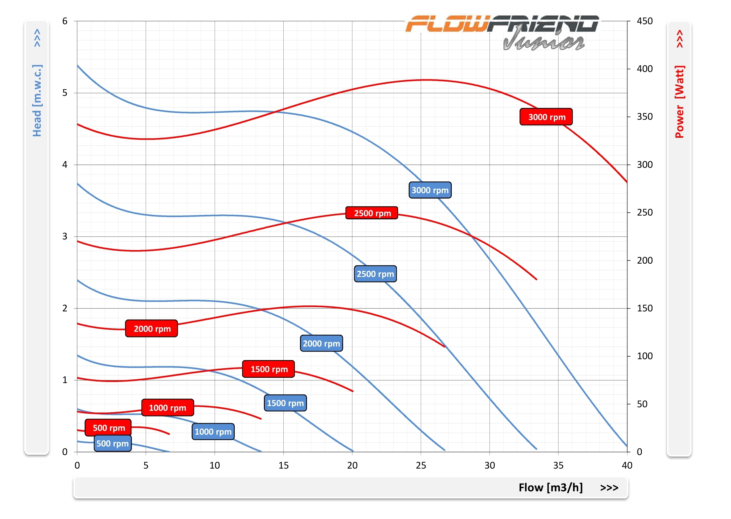Die FlowFriend Junior besitzt eine von der Pumpe getrennte Steuerelektronik und ist für geringere Anforderungen gebaut. Sie verpumpt bis zu 40 m3/Stunde und weist einen Maximaldruck von 7 m WS auf.