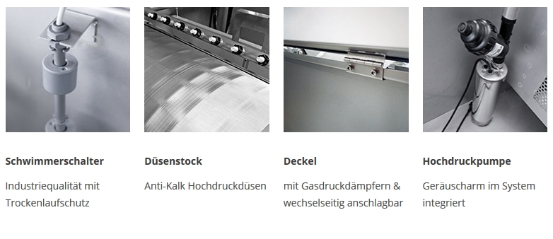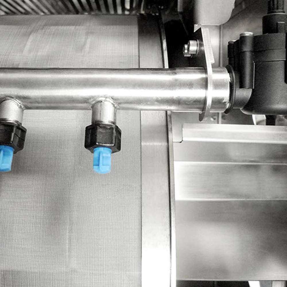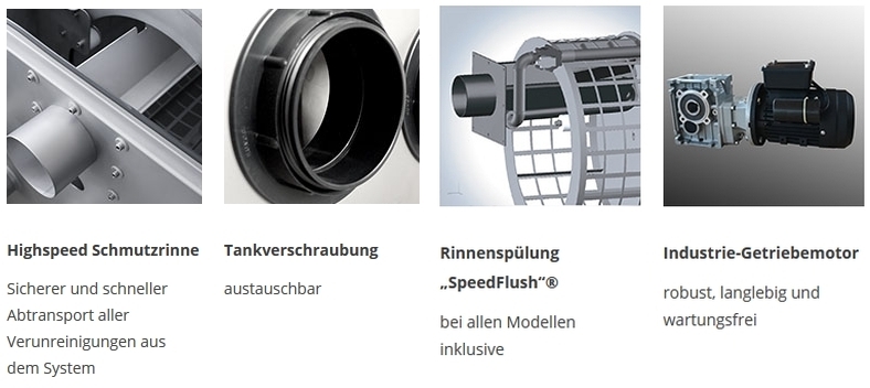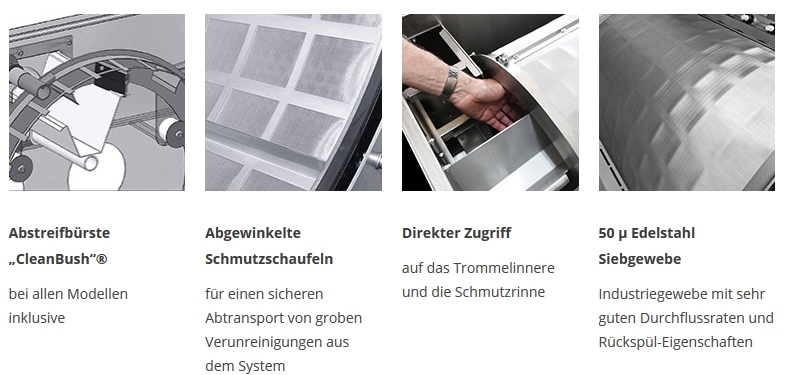 Technische Finessen wie z.B. eine spezielle, wartungsfreie und langlebige Lagerung der Trommel-Führungsrollen, sowie ein neu entwickeltes Spritzschutzblech im Deckel sorgen noch einmal für einen verbesserten Rundlauf und eine deutliche Reduzierung des Betriebsgeräusches während der Trommelreinigung. Die Filtergehäuse werden aus speziell passiviertem V4A Edelstahl hergestellt. Für die notwendige Steifigkeit sorgt eine neu entwickelte Motorhalterung und zusätzliche, massive Edelstahlstreben innen und außen am Filter.