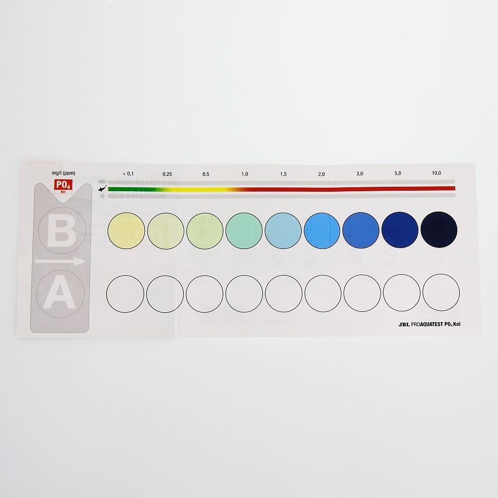 Abstufung der Werte: < 0,1; 0,25; 0,5; 1,0; 1,5; 2,0; 3,0; 5,0; 10 mg/l PO4.