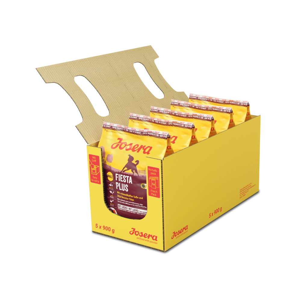 Feiert die Vitalität unserer Fellnasen: Josera Fiesta Plus für ausgewachsene Hunde sorgt nicht nur durch die zweifarbigen Kroketten für Abwechslung im Napf. Die roten Vital Booster Chips bieten dank wertvollen Vitaminen sowie Taurin und L-Carnitin einen zusätzlichen Booster für die Vitalität unserer Vierbeiner. Für ein ganz besonderes Geschmackserlebnis sorgen zudem die knusprigen, braunen Kroketten, die sich durch das integrierte Soßenpulver und die Zugabe von Wasser in ein Menü verwandeln, das auch wählerische Hunde überzeugt.