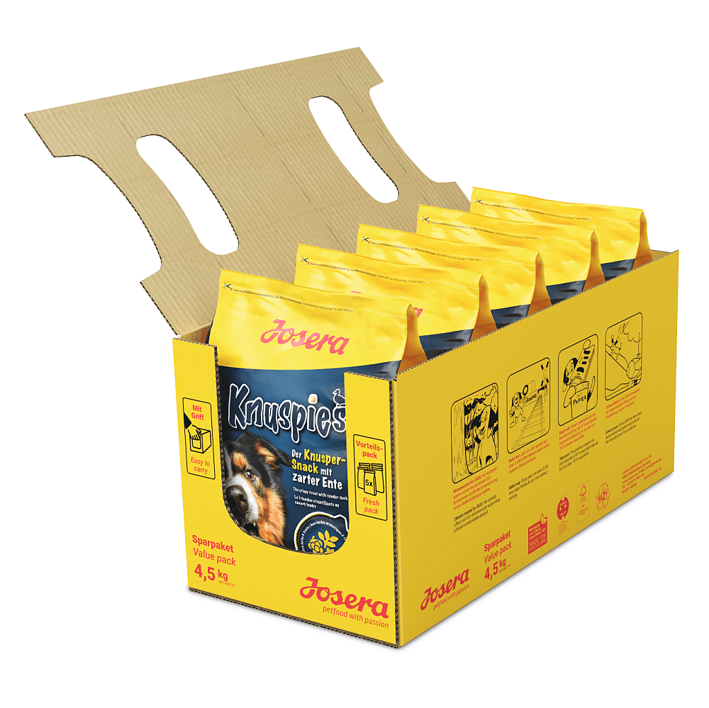 Josera Knuspies sind die perfekte Belohnung für zwischendurch. Die knackigen Kugeln sind besonders schmackhaft durch zartes Geflügel, mit 15 % schmackhafter Ente. Durch den extra geringen Fettgehalt sind Knuspies besonders verträglich. Josera Knuspies haben eine optimale Größe und sind somit ideal für das tägliche Training geeignet.