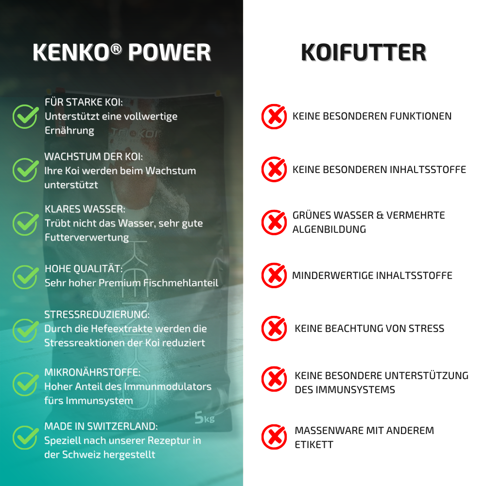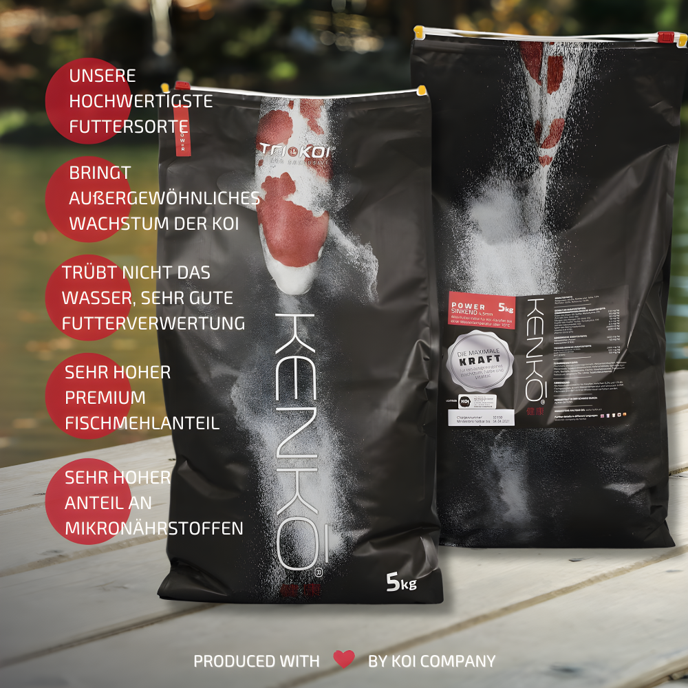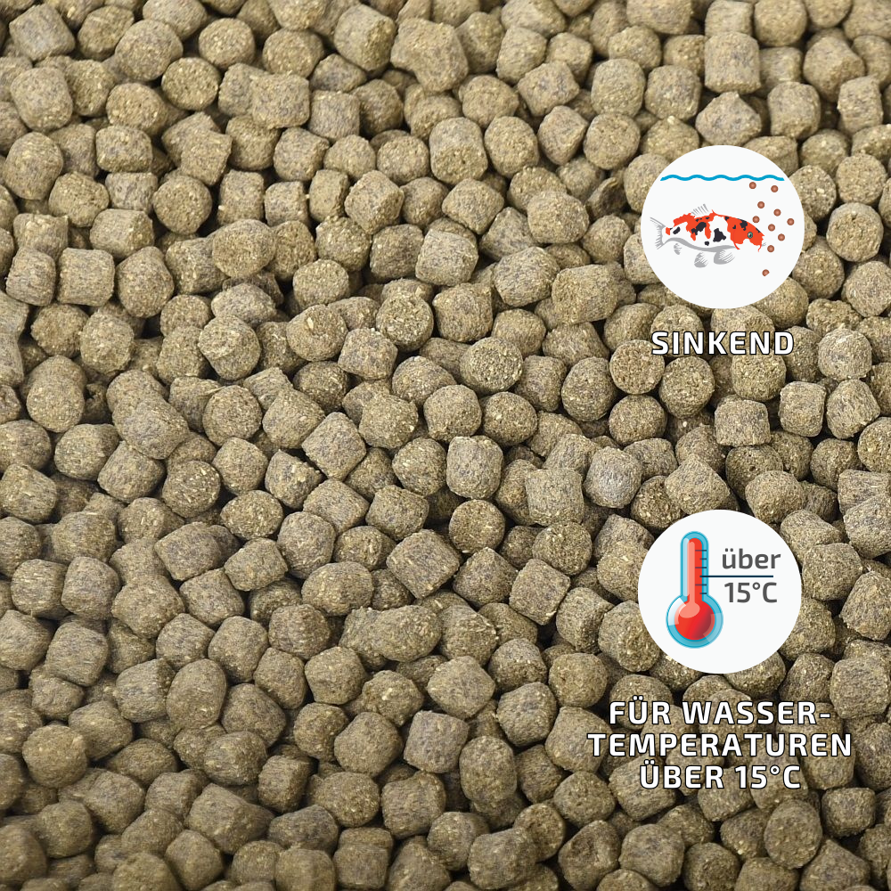 Und darum geht es bei diesem Futter hauptsächlich. Dank seiner hochwertigen Inhaltsstoffe und großen Mengen an Premium Fischmehl, Mikronährstoffen und Immunstimulanzien garantiert dieses Futter ein außergewöhnliches Wachstum der Koi. Die Reserven der Fische werden herausgekitzelt, da die Gesundheit und Abwehrkräfte der Fische so gestärkt werden, dass der Fisch natürlich groß wächst. Absichtlich wurde die Pelletgröße etwas kleiner gewählt, da somit jeder Fisch jeden Alters davon in den Genuss kommt. Das Futter wurde so produziert, dass es langsam zu Boden schwebt. Dies vereitelt die Futterschlacht im Wasser und auch scheue und langsame Koi kommen ans Futter ran.