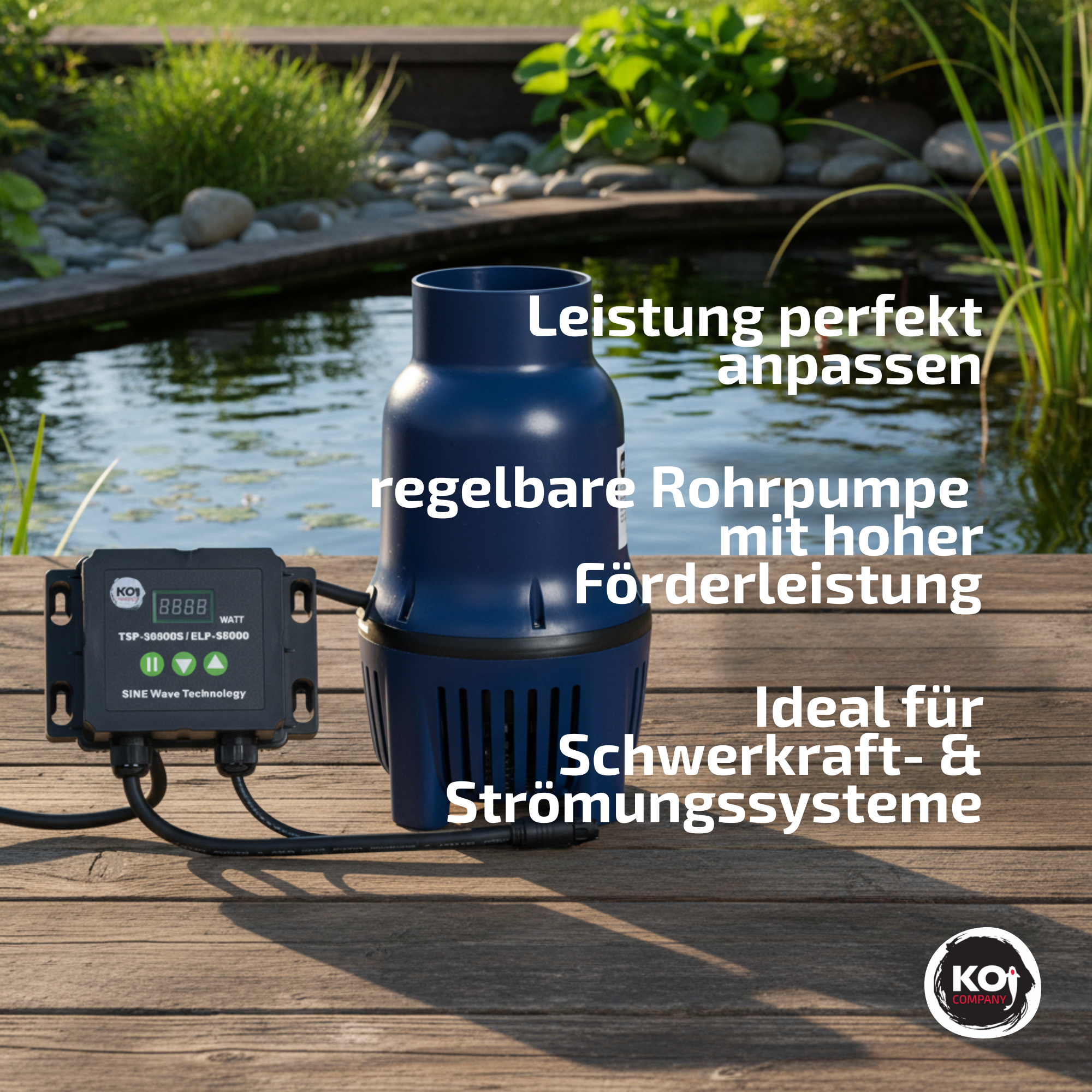 Die Koi Company ELP Vario Serie ist die erste regelbare Rohrpumpe mit hoher Förderleistung und gleichzeitig geringem Energieverbrauch – perfekt für effiziente Teichsysteme.