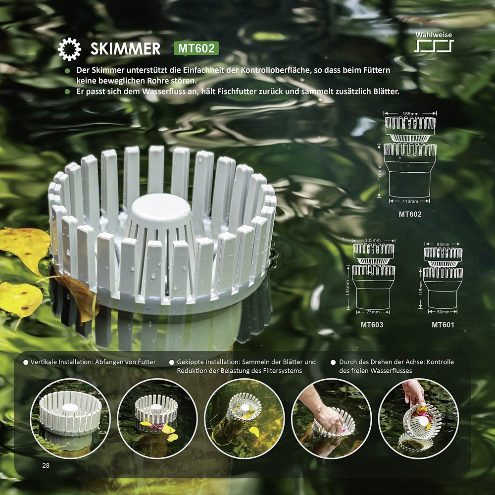 Wenn der Skimmer vertikal eingebaut wird, hält er Futter zurück. Bei einer schrägen Installation hält er Blätter, kleine Äste und große Verunreinigungen zurück.