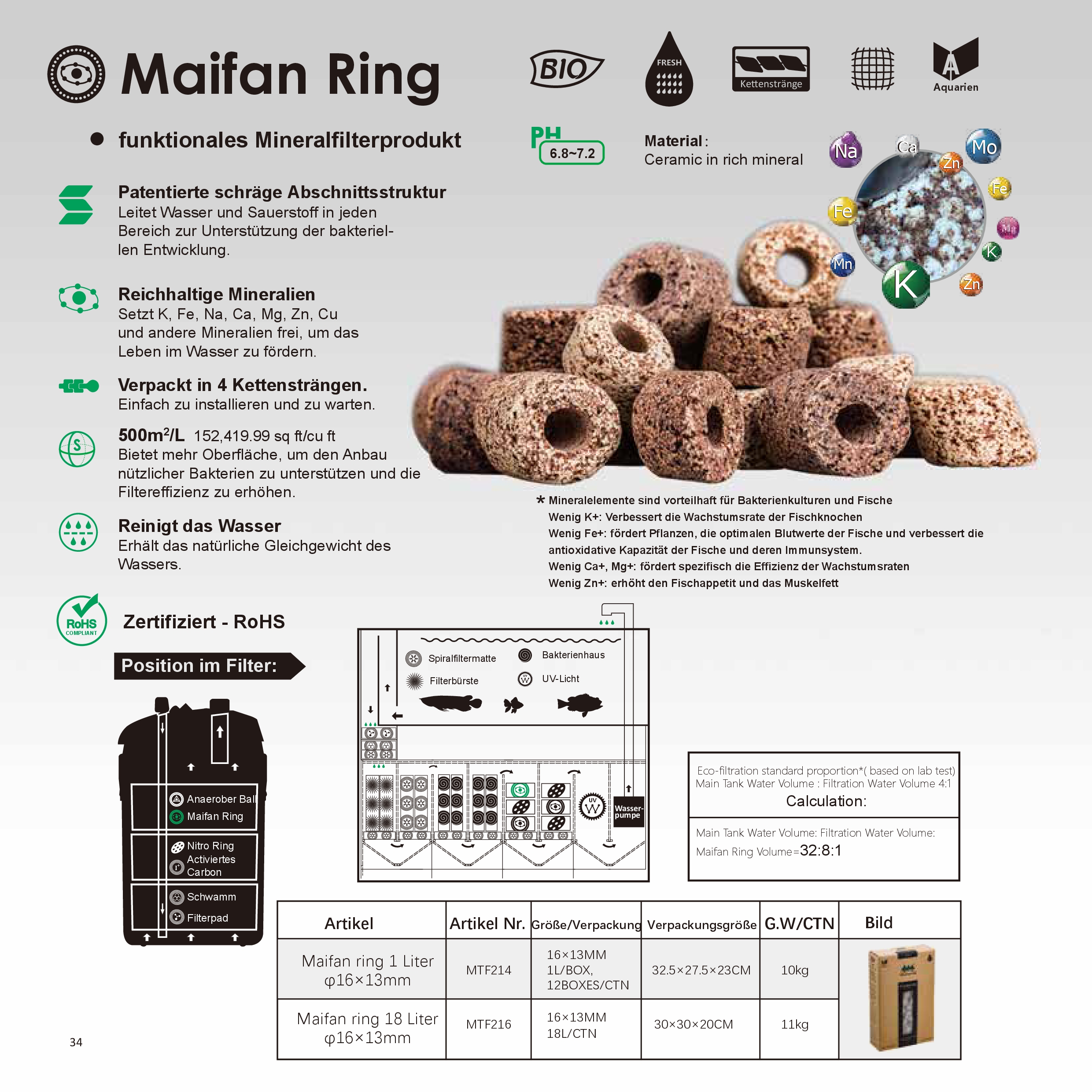 • Enthält mehr als 20% A1²O³, womit der PH-Wert im Wasser gut ausgeglichen wird
