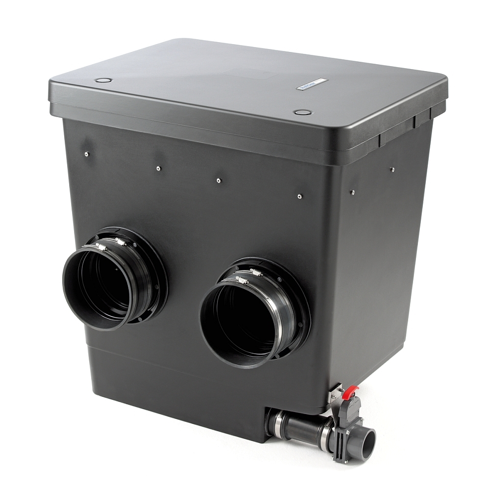 Das Modul wird mit 2 Individualkörben (2 x 8 L Volumen) ausgeliefert, die mit weiterem Biomaterial (z.B. Siporax®) bestückt werden können. Ein integrierter Ablauf am Boden inkl. Zugschieber dient der Entsorgung abgesetzten Schmutzes.