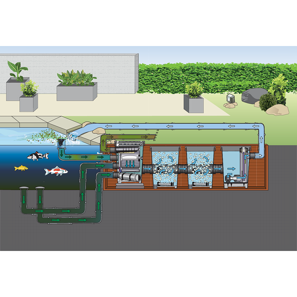 Die Vollautomatische Reinigung des Trommelfilters führt zu wenig Aufwand und Pflege in der Reinigung des Filters und gewährt dem Nutzer maximalen Komfort an seinem Koiteich.