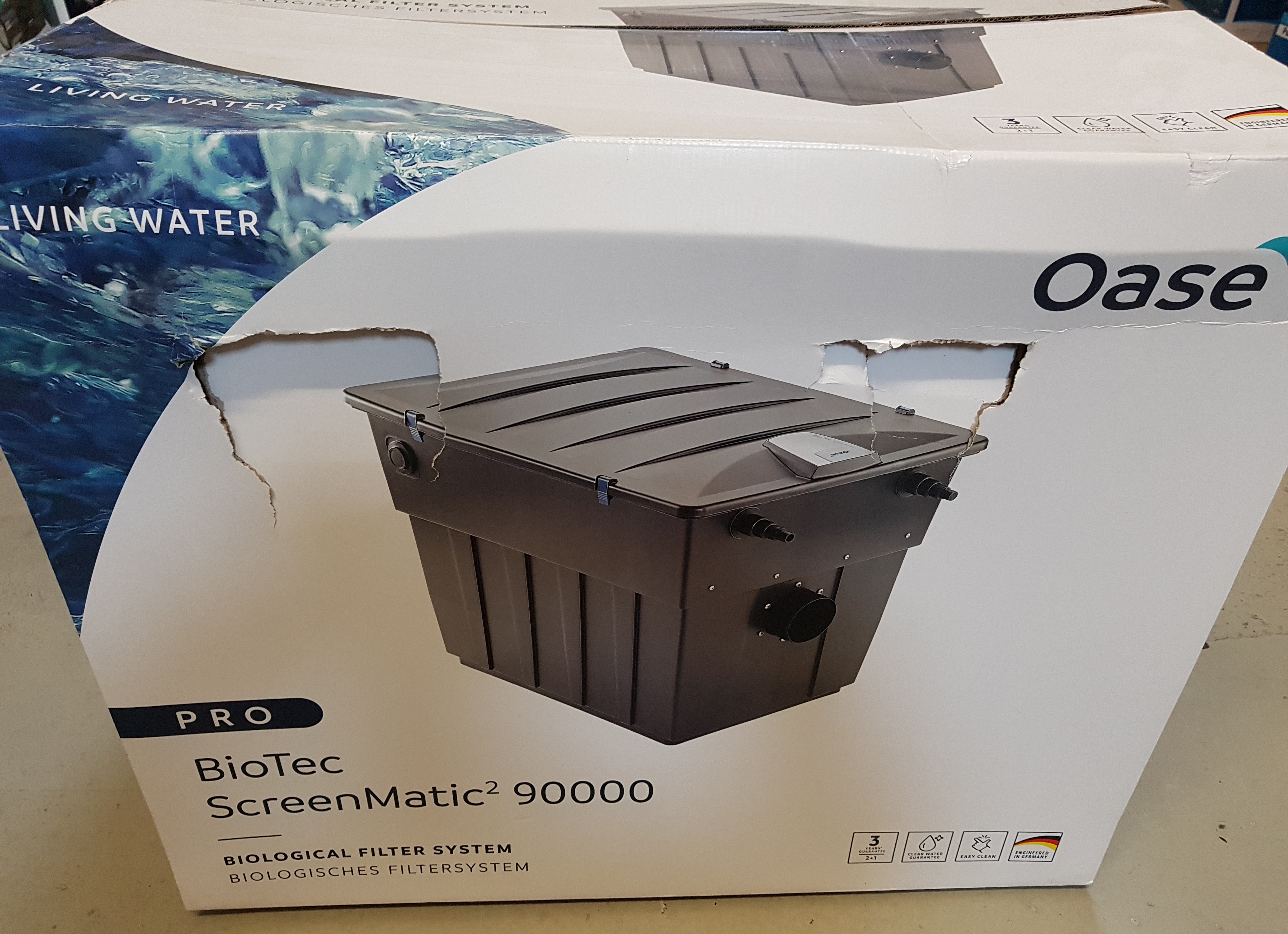 Die Oase BioTec Screen Matic² 90000 ist neuwertig, lediglich die Verpackung ist beschädigt und einer der Deckelclips fehlt. Der Body wurde durch ein Originalteil ersetzt.