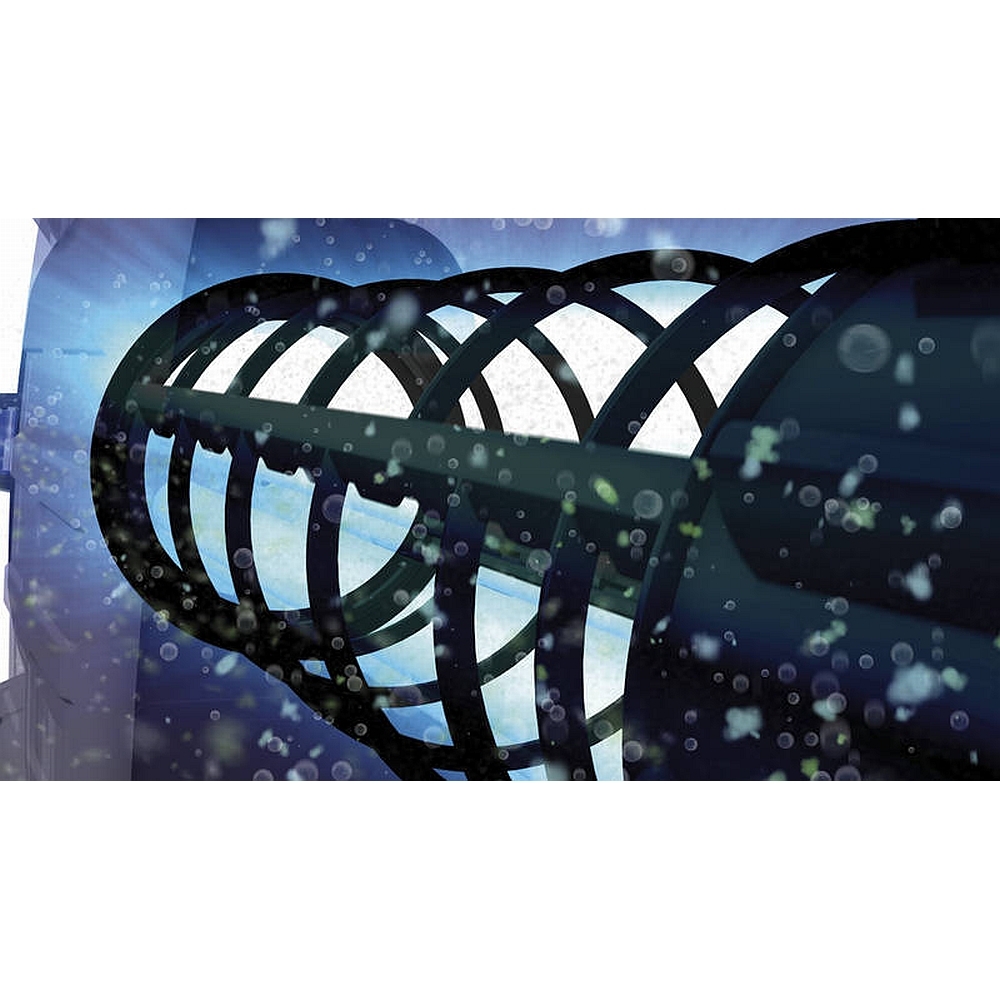 Im Gerät befindet sich eine Ummantelung um das Quarzglas wodurch das Quarzglas im inneren kontinuierlich und selbständig von Ablagerungen auf der Quarzröhre befreit wird.