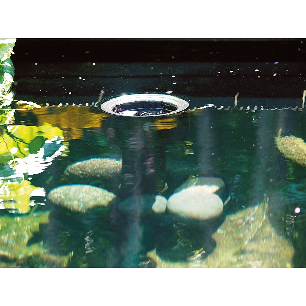 Mit einer separaten Pumpe zwischen 8.000 – 20.000 Liter Leistung und einer Beschwerung des Standfußes durch Steine kann der Teich (Koiteich, Gartenteich, Schwimmteich) auf bis zu 40m² Oberfläche (Blätter, Blütenstaub, Äste) abgesaugt werden.