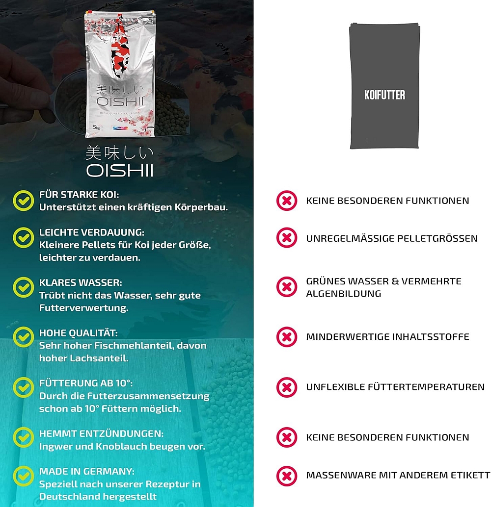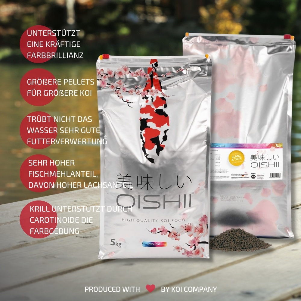 Oishii bedeutet Lecker! Und das muss ein Futter bekanntlich sein, damit unsere Koi es gerne fressen.