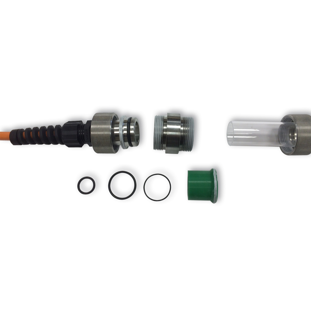 Das Gehäuse wurde speziell für uns hergestellt. An der Oberseite befindet sich ein Gewinde, in welches die Lampe genau hineinpasst und mit dem O-Ring abdichtet. Durch eine Führung im Gehäuserohr kann nun dem Glaskörper nichts mehr passieren. Alle Ein- und Ausgänge sind individuell wählbar.