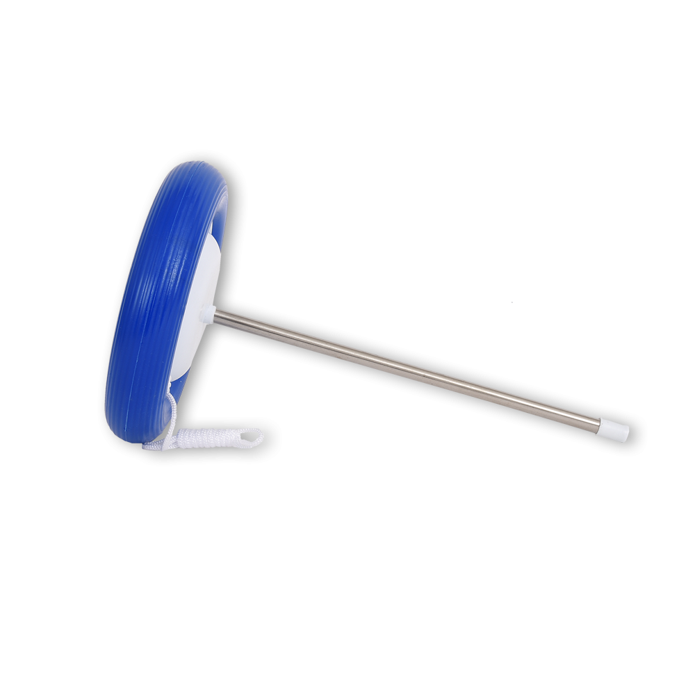 Dieses Thermometer hat einen Durchmesser von 18 cm und ist aus rostfreiem Edelstahl, der Rand besteht aus einem Weichschaum-Schwimmkörper mit Befestigungsleine.