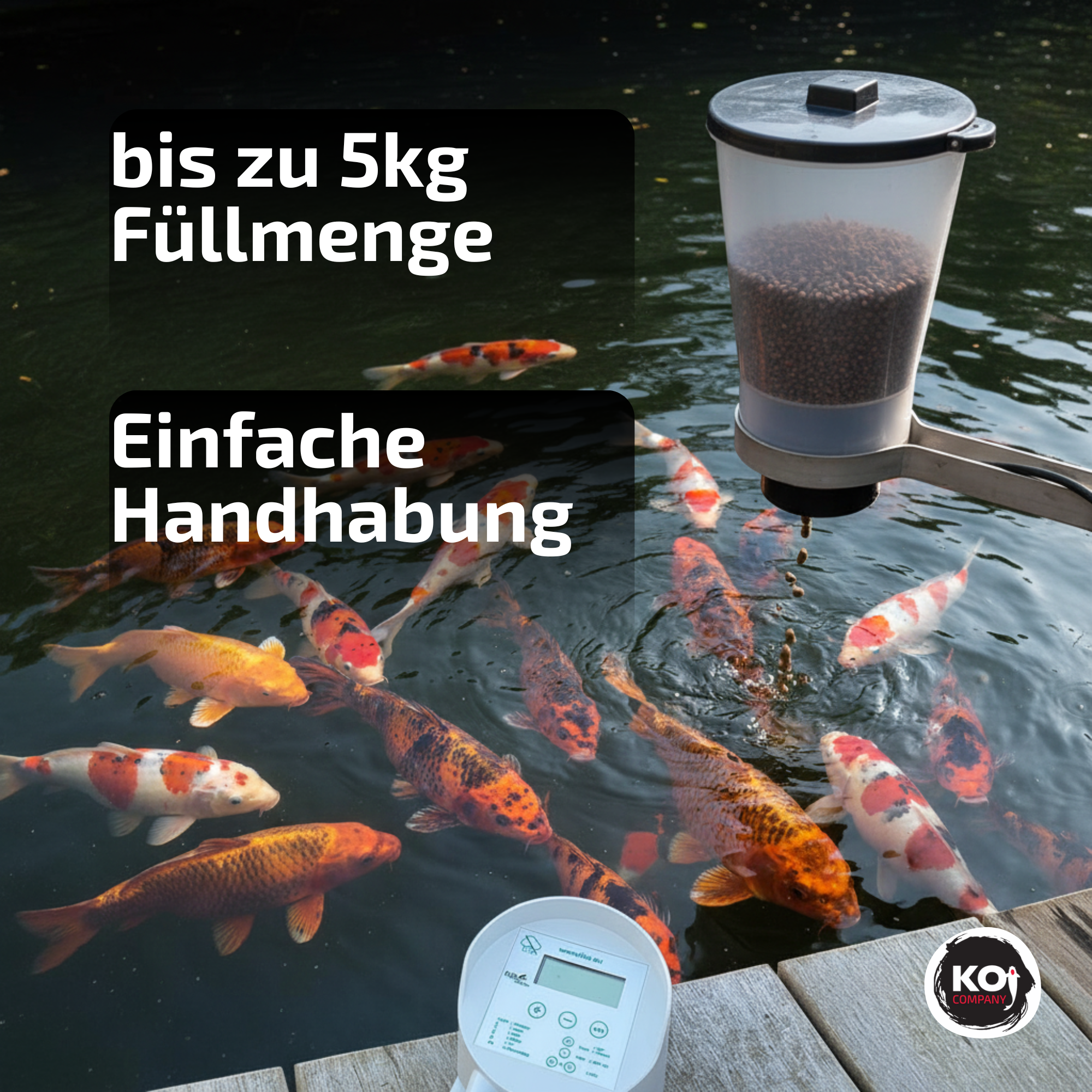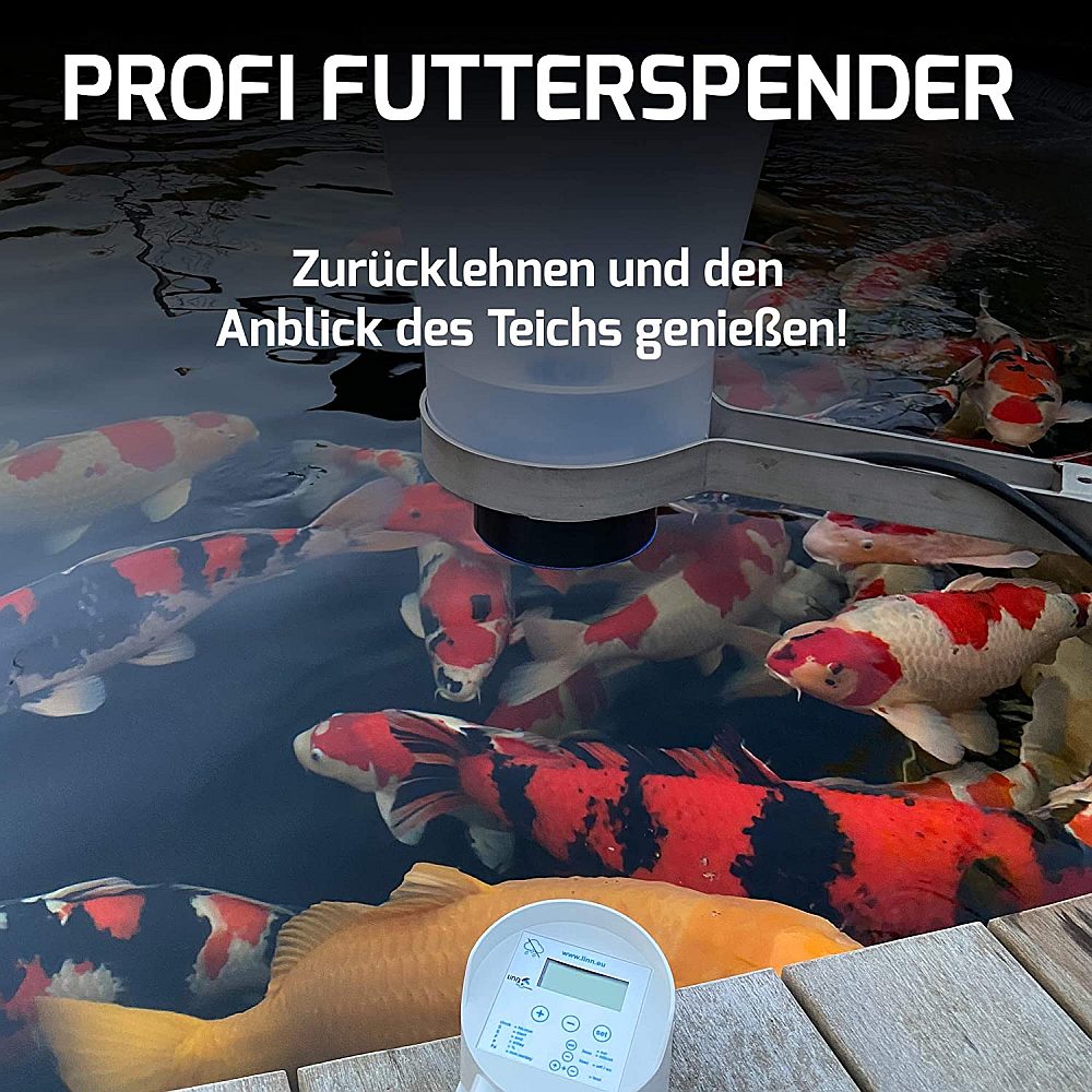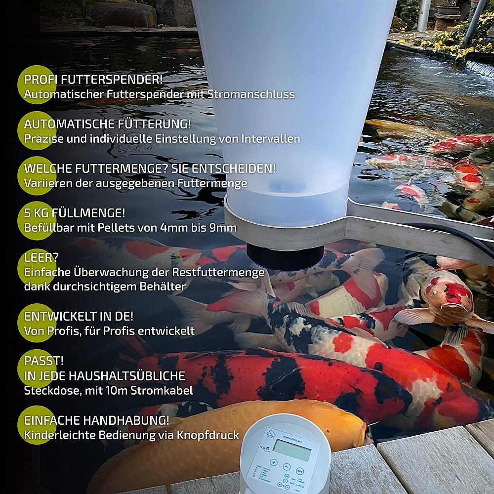 • Futtermenge kann variiert werden von 10 Gramm bis 2,5 kg (5L Fassungsvermögen) Koifutter