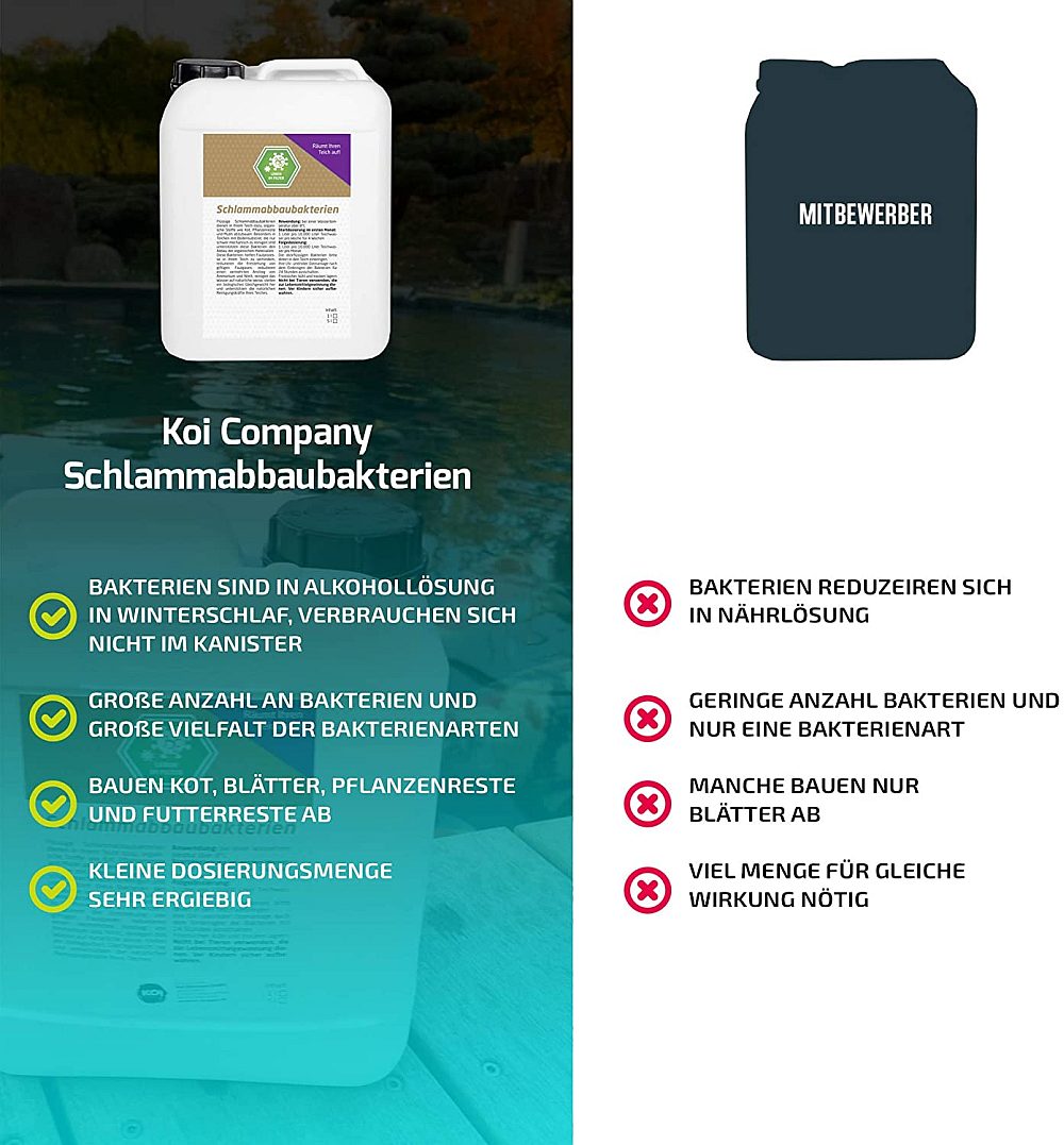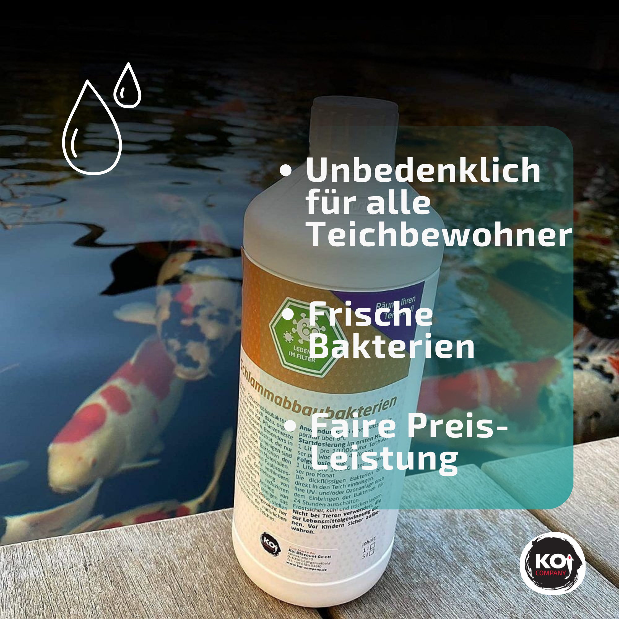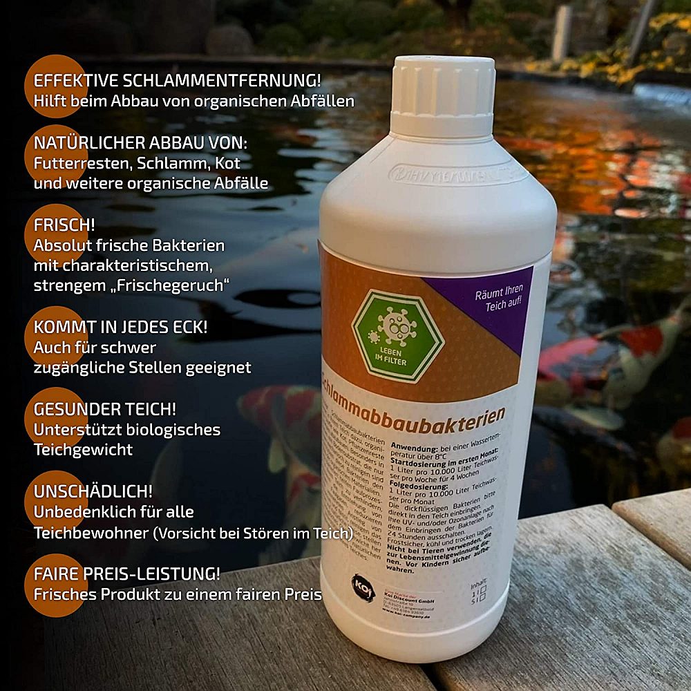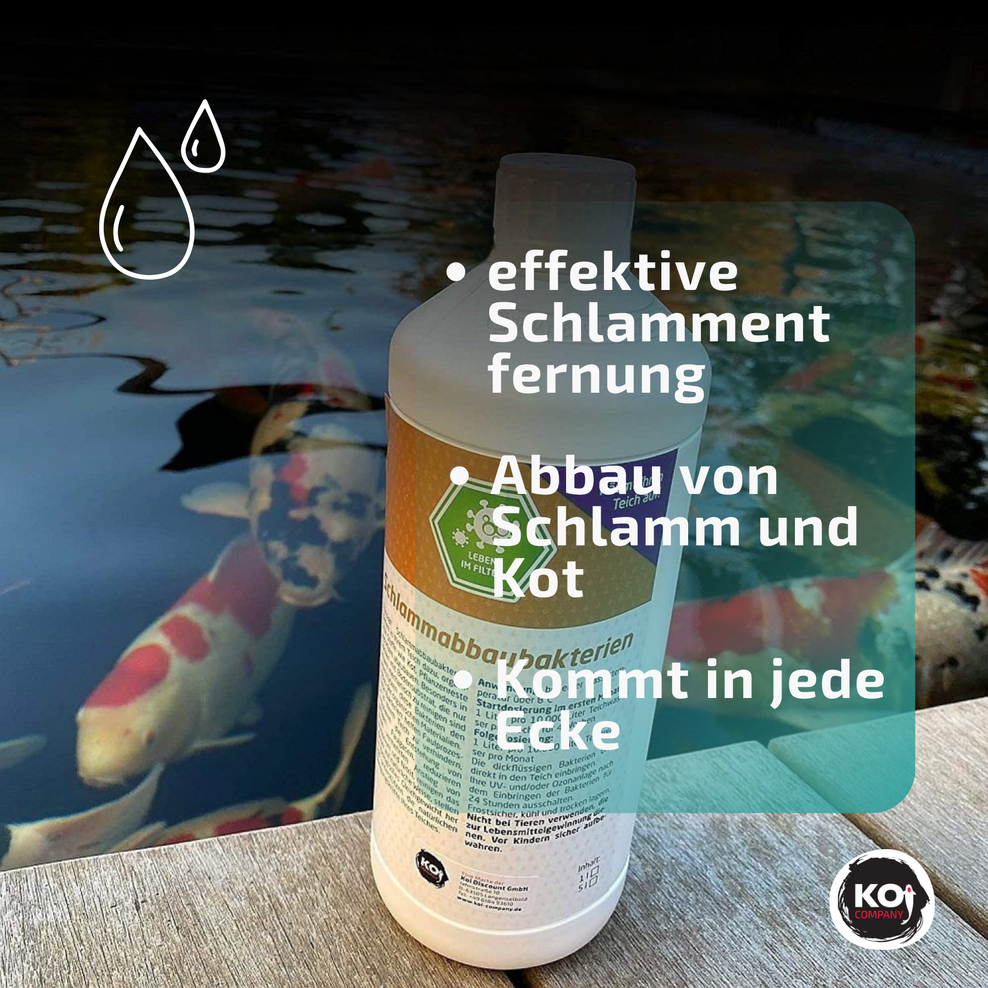 Reste von Kot, Futter und organischen Abfällen gehören nicht in den Teich. Wir haben für Koi Company diese Schlammabbaubakterien herstellen lassen. Diese unterstützen das biologische Gleichgewicht und sorgen auch bei schwer zugänglichen Stellen dafür, dass Schlamm und organische Reste abgebaut werden.
