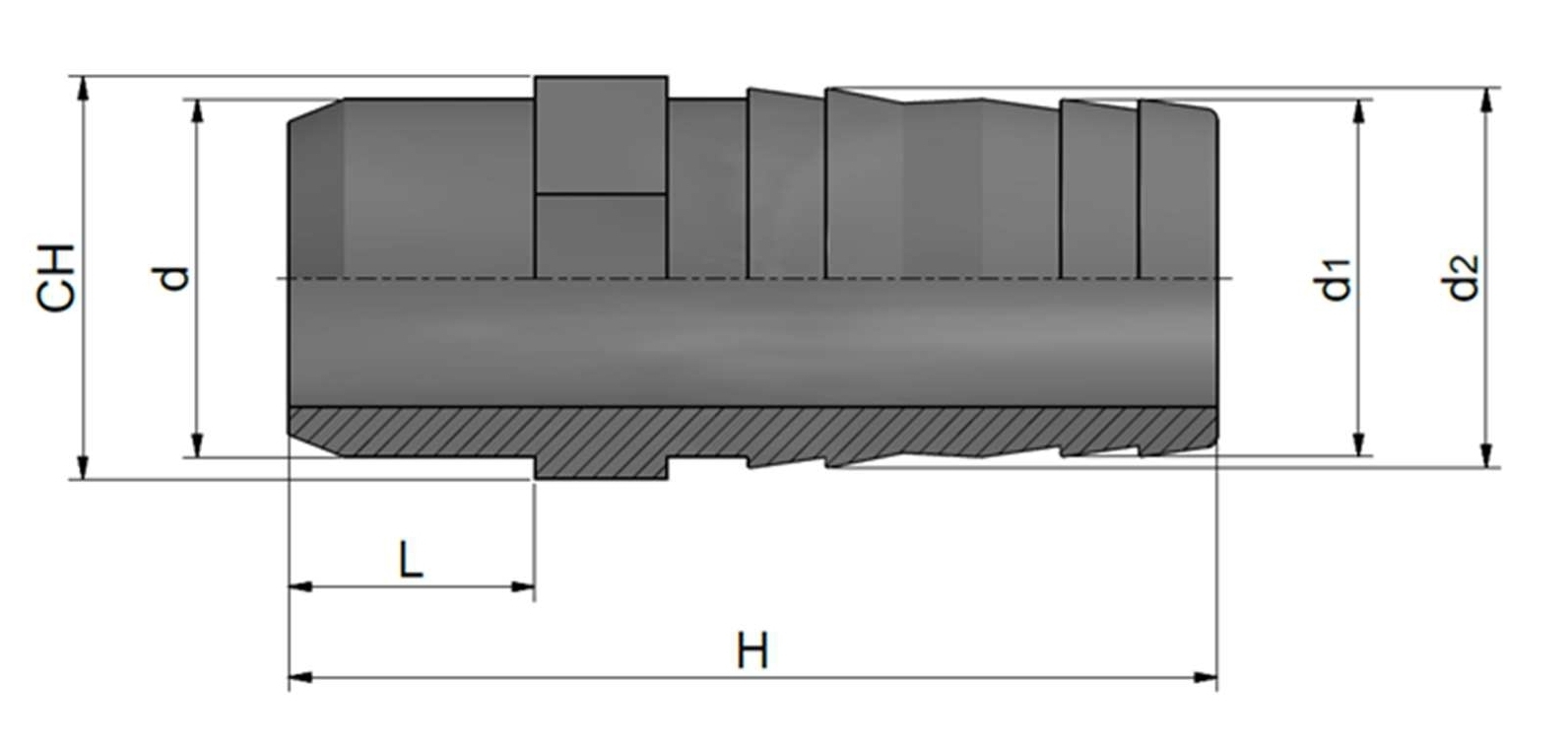 (d) Durchmesser links (d1) Durchmesser (größter) rechts (d2) Durchmesser rechts (L) Länge Klebestutzen (H) Gesamtlänge (CH) Durchmesser (größter) links Gewicht