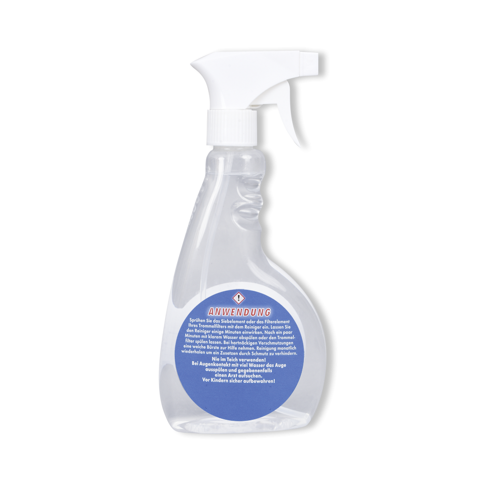 Sprühen Sie das Sieb oder Filterelement mit dem Reiniger ein. Lassen Sie den Reiniger einige Minuten einwirken. Danach mit klarem Wasser abspülen oder Trommelfilter spülen lassen.