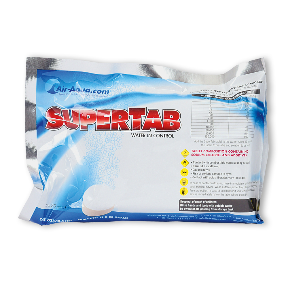 SuperTab enthält das Oxidans Chlordioxid (CLO2) in Tablettenform. Dabei handelt es sich um eine völlig neue Entwicklung, die die Anwendung dieses Produkts sehr einfach macht. Chlordioxid (nicht zu verwechseln mit Chlor!) ist ein relativ schwaches Oxidans. Daher darf es in bestimmten Konzentrationen sowohl in Trinkwasser als auch in, von lebenden Tieren/Organismen besiedelten, Teichen oder Becken frei verwendet werden. Chlordioxid ist schon seit beinahe 200 Jahren bekannt. Entdeckt wurde es 1814 von Humphrey Davy. Dieses einzigartige Oxidans kann schon bei sehr niedrigen Konzentrationen äußerst effektiv gegen Viren, Schimmel und pathogene Bakterien eingesetzt werden. Anaerobe Bakterien können keine Resistenz gegen Chlordioxid aufbauen, weil ihre Zellstruktur zerstört wird. Chlordioxid ist ein sehr selektives Oxidans und reagiert vor allem mit organischen Stoffen. Es erzeugt keine (schädlichen) Restprodukte. Nur eine sehr kleine Menge Chlorid (wie Küchensalz) bleibt nach Gebrauch zurück. Chlordioxid ist in geringen Konzentrationen im Wasser geruchlos, anders als etwa Chlor. Der größte Vorteil von Chlordioxid im Vergleich zu anderen Oxidantien (Wasserstoffperoxid, Ozon und Chlor) ist seine geringe Oxidationskraft in Kombination mit einem hohen Oxidationsvermögen. Chlordioxid wird häufig bei der Herstellung von Trinkwasser, der Verarbeitung und Lagerung von Lebensmitteln, im Obstanbau und in der Fleisch verarbeitenden Industrie eingesetzt.