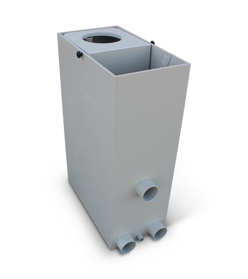 Das Wasser wird durch Schotten auf das Siebelement geleitet. Unter dem Siebelement ist ebenfalls eine Leitplatte montiert, die für eine ruhige Führung des Wassers in möglichst großem Abstand zu den 90 mm Pumpenanschlüssen sorgt.