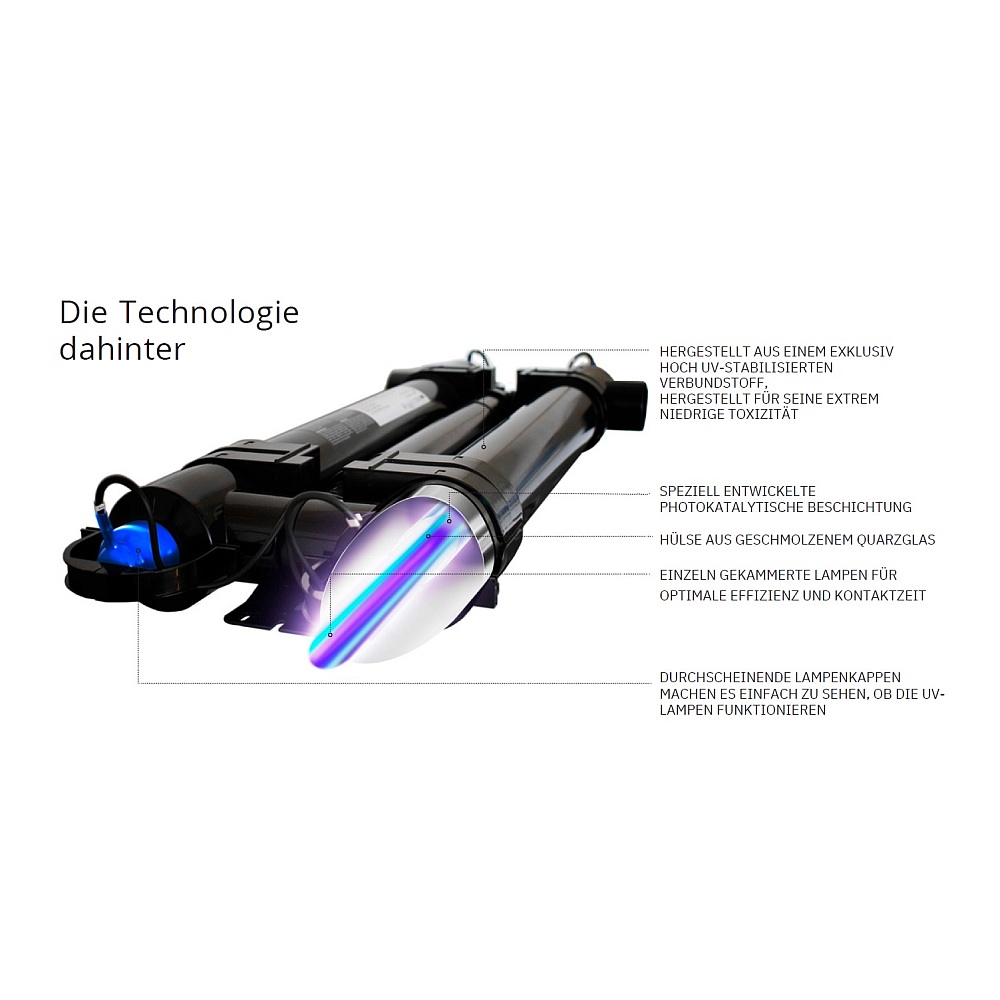 - ACHTUNG dieses Produkt emittiert UV-C-Strahlung! Setzen Sie ihre Augen und Haut nicht dem ungesicherten Produkt aus! Befolgen Sie die Installationsanleitung und/oder das Benutzerhandbuch. Nicht geeignet für die Allgemeinbeleuchtung.