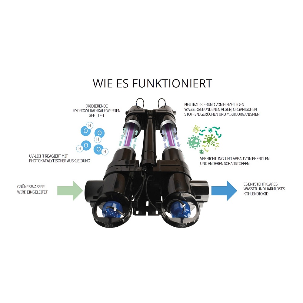- Die entstehenden Hydroxylradikale wirken wie Ozon und machen das Wasser noch klarer.