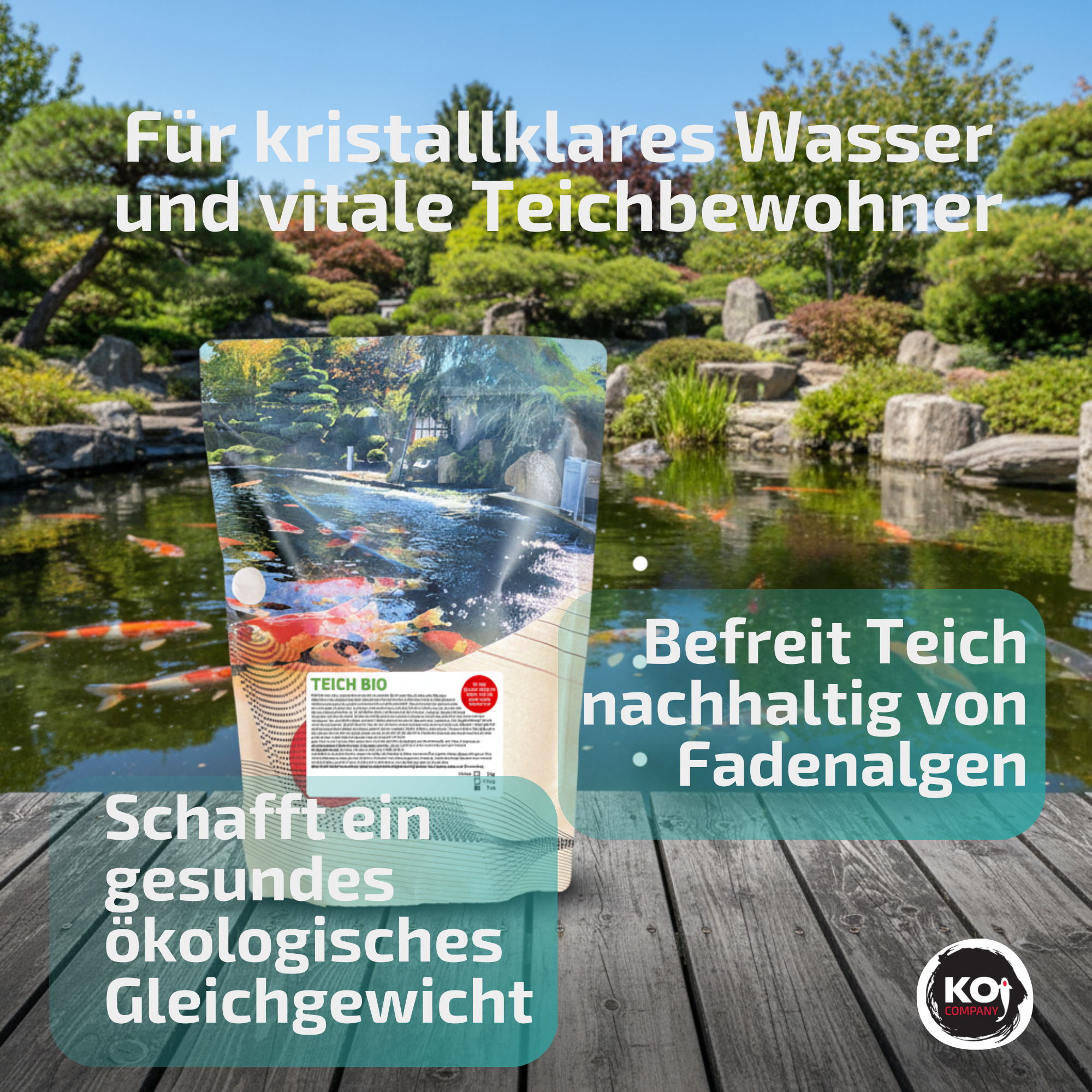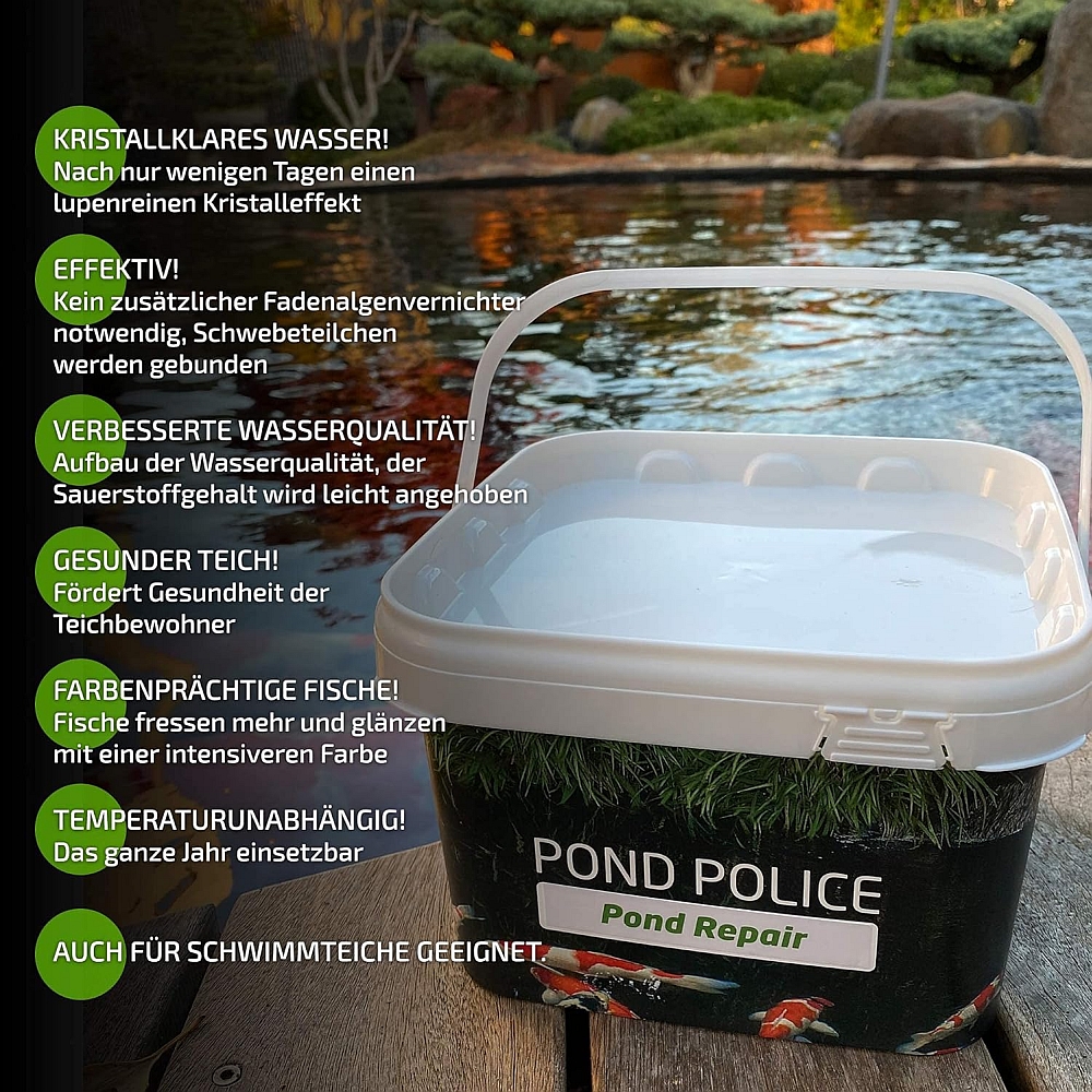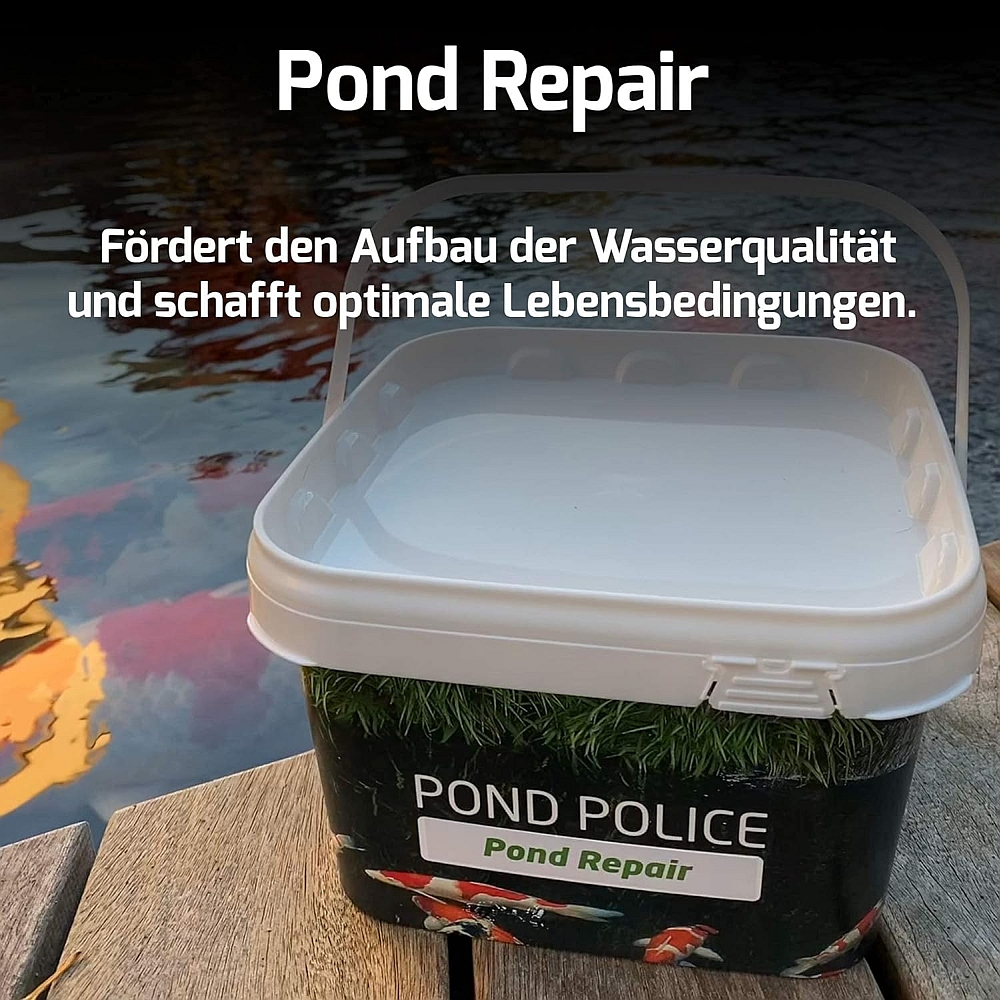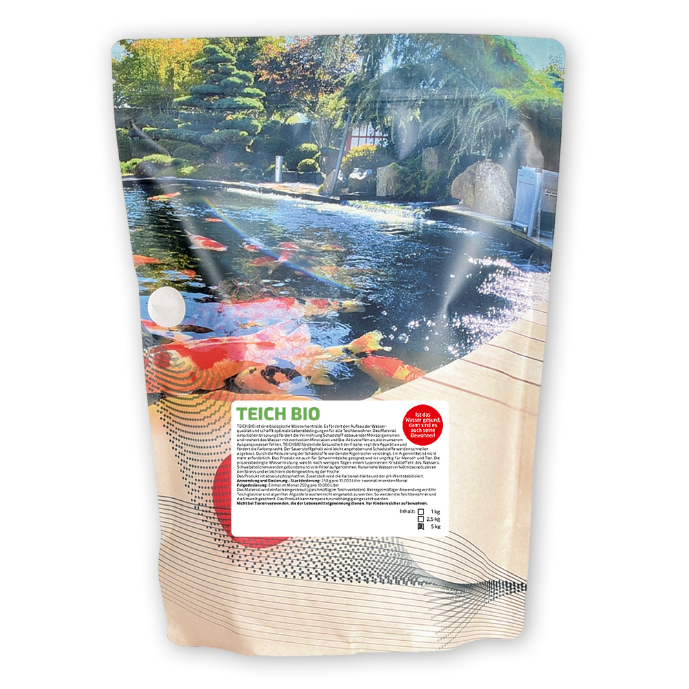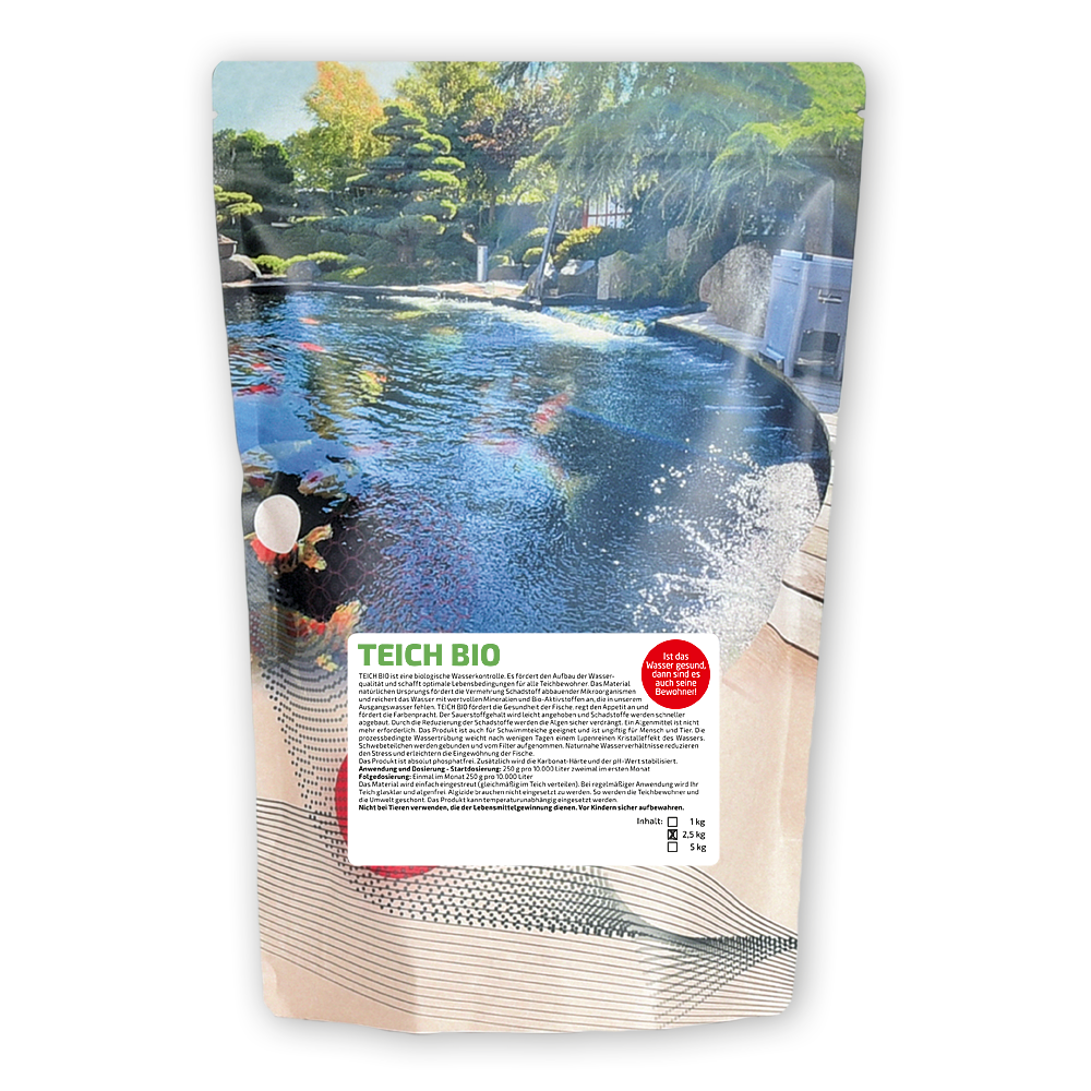 Teich Bio (Pond Repair) ist eine biologische Wasserkontrolle. Es fördert den Aufbau der Wasserqualität und schafft optimale Lebensbedingungen für alle Teichbewohner. Das Material natürlichen Ursprungs fördert die Vermehrung Schadstoff abbauender Mikroorganismen und reichert das Wasser mit wertvollen Mineralien und Bio-Aktivstoffen an, die in unserem Ausgangswasser fehlen.  Teich Bio (Pond Repair) fördert die Gesundheit der Fische, regt den Appetit an und fördert die Farbenpracht. Der Sauerstoffgehalt wird leicht angehoben und Schadstoffe werden schneller abgebaut.