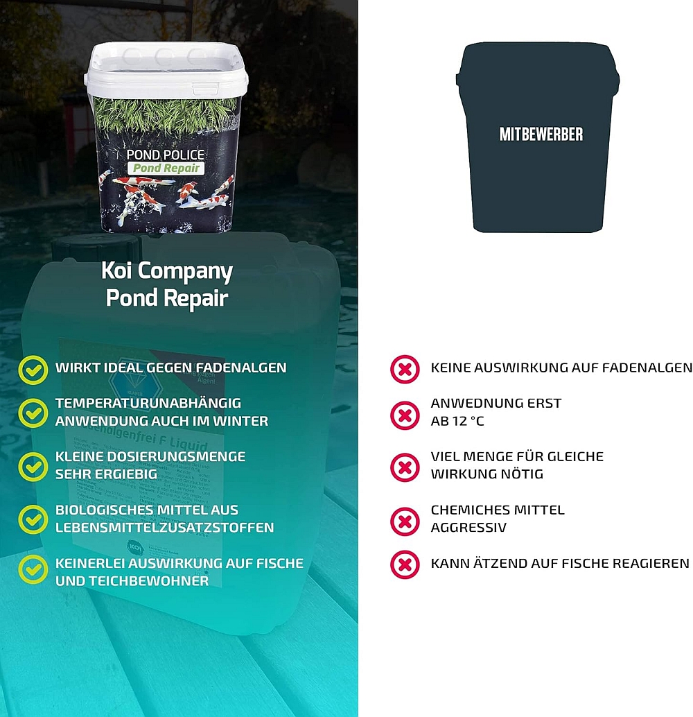 Durch die Reduzierung der Schadstoffe werden die Algen sicher verdrängt. Ein Algenmittel ist nicht mehr erforderlich. Das Produkt ist auch für Schwimmteiche geeignet und ist ungiftig für Mensch und Tier. Die prozessbedingte Wassertrübung weicht nach wenigen Tagen einem lupenreinen Kristalleffekt des Wassers. Schwebeteilchen werden gebunden und vom Filter aufgenommen.  Natur-nahe Wasserverhältnisse reduzieren den Stress und erleichtern die Eingewöhnung