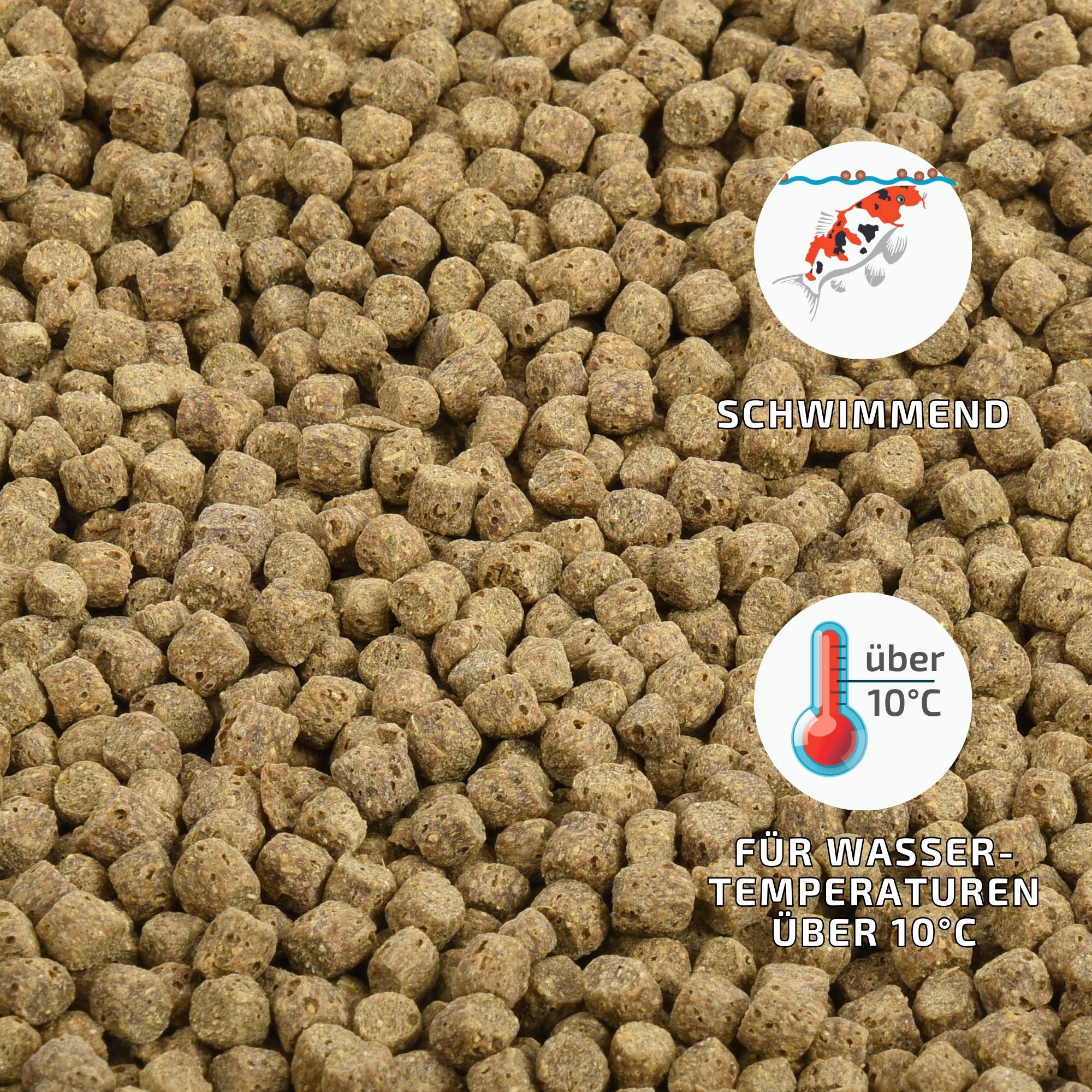 Füttern Sie Ihre Koi in Abhängigkeit von der Wassertemperatur 1-3 x täglich. Als Alleinfuttermittel für Koi Karpfen, zwischen 0,2% und 1,5% des Fischgewichtes, je nach Wassertemperatur und Jahreszeit.