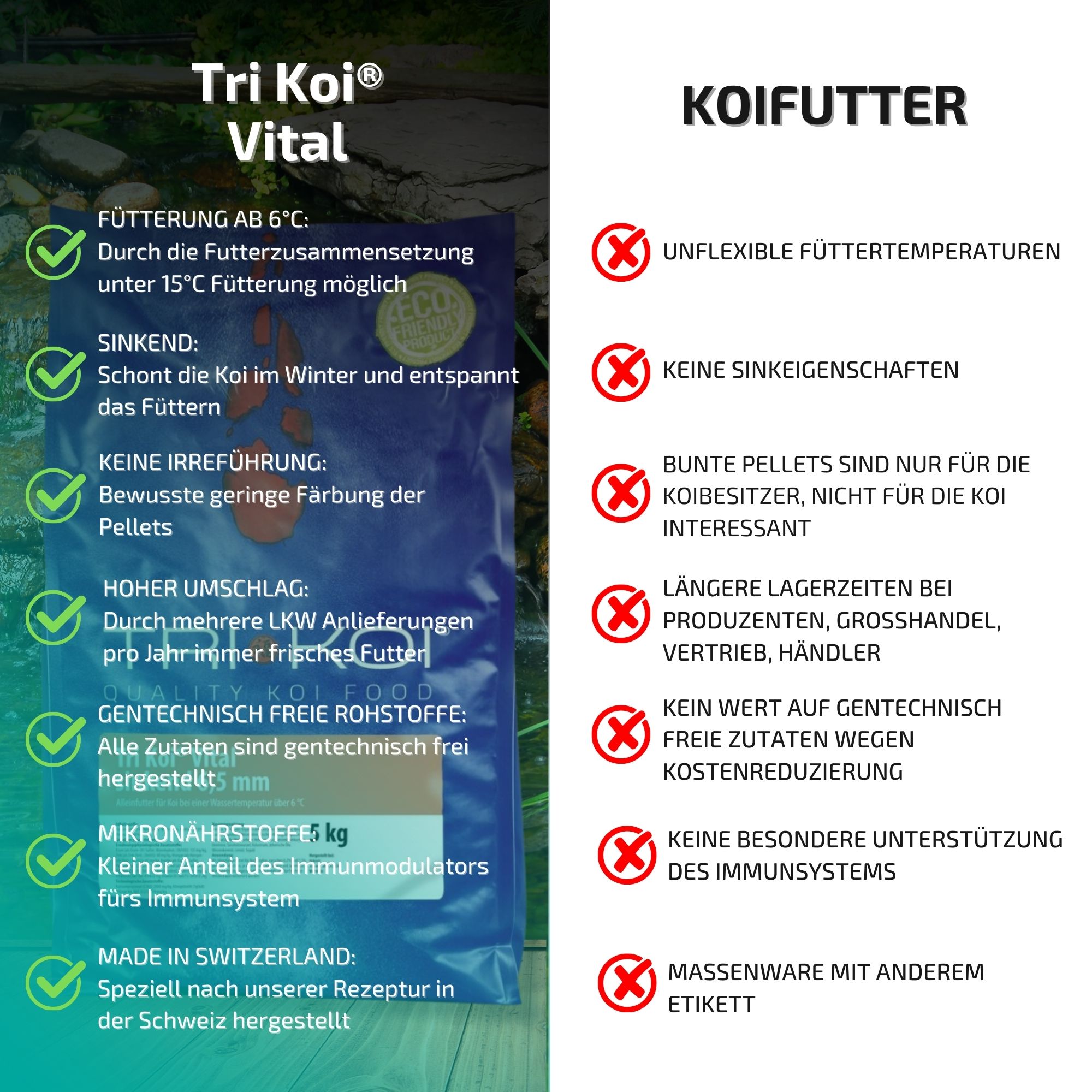 Wenn Sie sich mit dem Hersteller näher auseinandersetzen (Alpha CH 31265) werden Sie zwangsläufig auch auf den exklusiven Mikronährstoffkomplex AQUACULTURE GUARD® stoßen. Dieser Stoff ist in jeder unserer Tri Koi® Futtersorten von Hokovit enthalten, sowie die exklusive Kräutermischung aus dem Kenko® Extra.