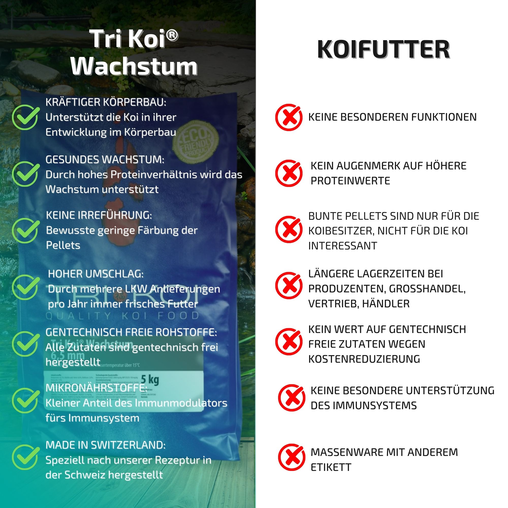 Wenn Sie sich mit dem Hersteller näher auseinandersetzen (Alpha CH 31265) werden Sie zwangsläufig auch auf den exklusiven Mikronährstoffkomplex AQUACULTURE GUARD® stoßen. Dieser Stoff ist in jeder unserer Tri Koi® Futtersorten von Hokovit enthalten, sowie die exklusive Kräutermischung aus dem Kenko® Extra.
