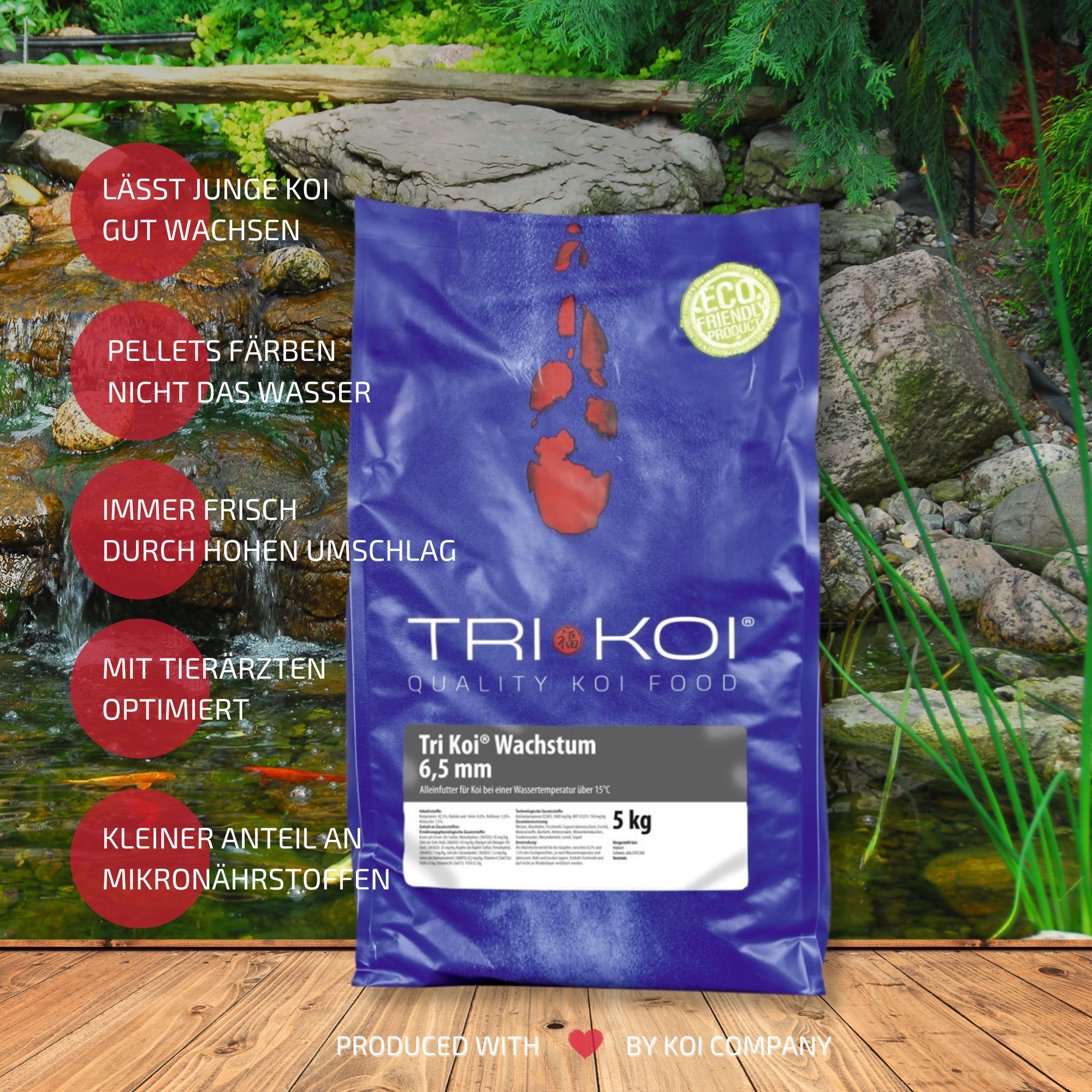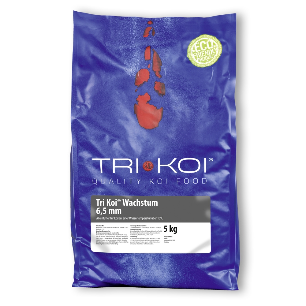 Tri Koi® Wachstum: hier wurde besonderes Augenmerk auf die Entwicklung der Koi gelegt. Mit diesem Futter werden Ihre Koi rasch größer, ohne dass Sie verfetten. Es handelt sich um ein Alleinfutter und Konditionsfutter, es kann aber auch mit anderen Futtersorten vermischt werden.