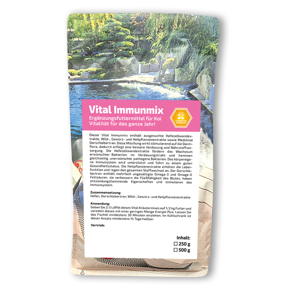 Geben Sie 2-3 Teelöffel dieses Immunmixes auf ½  kg Futter und veredeln dieses mit einer geringen Menge Energie Plus. Lassen Sie das Fischöl mindestens 30 Minuten einziehen. Im Kühlschrank ist dieser Ansatz mindestens 14 Tage haltbar.