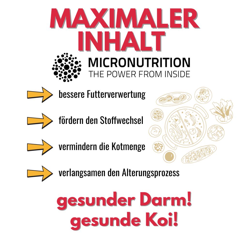 Diese einzigartige Kombination von HOKOVIT aus verschiedenen Hefeextrakt-Fraktionen und deren Mischverhältnis zueinander bewirken im Darm die Förderung des Wachstums der im Verdauungstrakt erwünschten Flora von Milchsäure- und Bifidusbakterien. Dadurch wird eine Besiedlung des Darmes mit Krankheitserregern (z.B. Coli-Bakterien) erheblich erschwert. Diese Stabilisierung der Darmflora wirkt sich nicht nur positiv auf die Tiergesundheit aus, sondern zeigt auch hervorragende Effekte bezüglich der Frühentwicklung des Verdauungstraktes. Die Immunität der Koi wird optimiert. Gleichzeitig steigt die Verdauungsleistung, so dass mehr Futter aufgenommen und dieses auch besser verdaut wird.